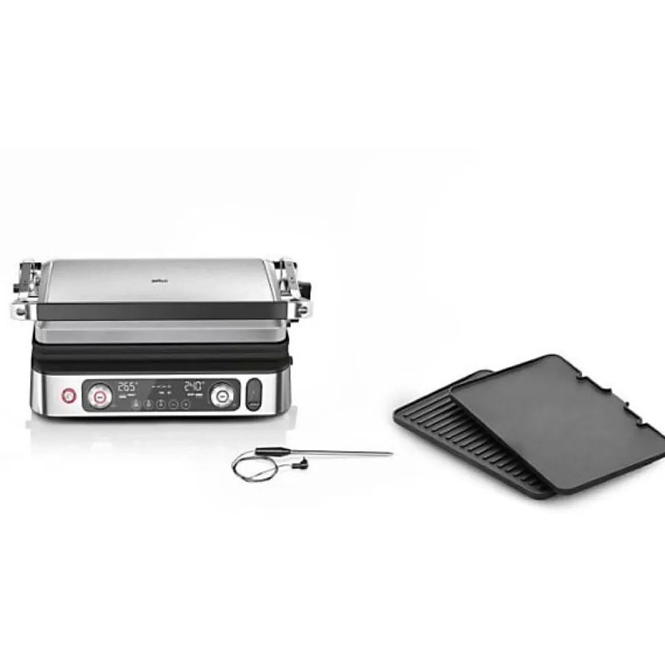 Grill multifonctions BRAUN Multi Grill 9 Pro 2200 W en noir et acier : plaques grill et plancha amovibles compatibles lave‑vaisselle, sonde thermique, 3 positions de chauffe (contact, ouvert, four) avec fonction saisie, thermostats indépendants et bac récupérateur amovible. Surface de cuisson généreuse pour jusqu’à 8 personnes.