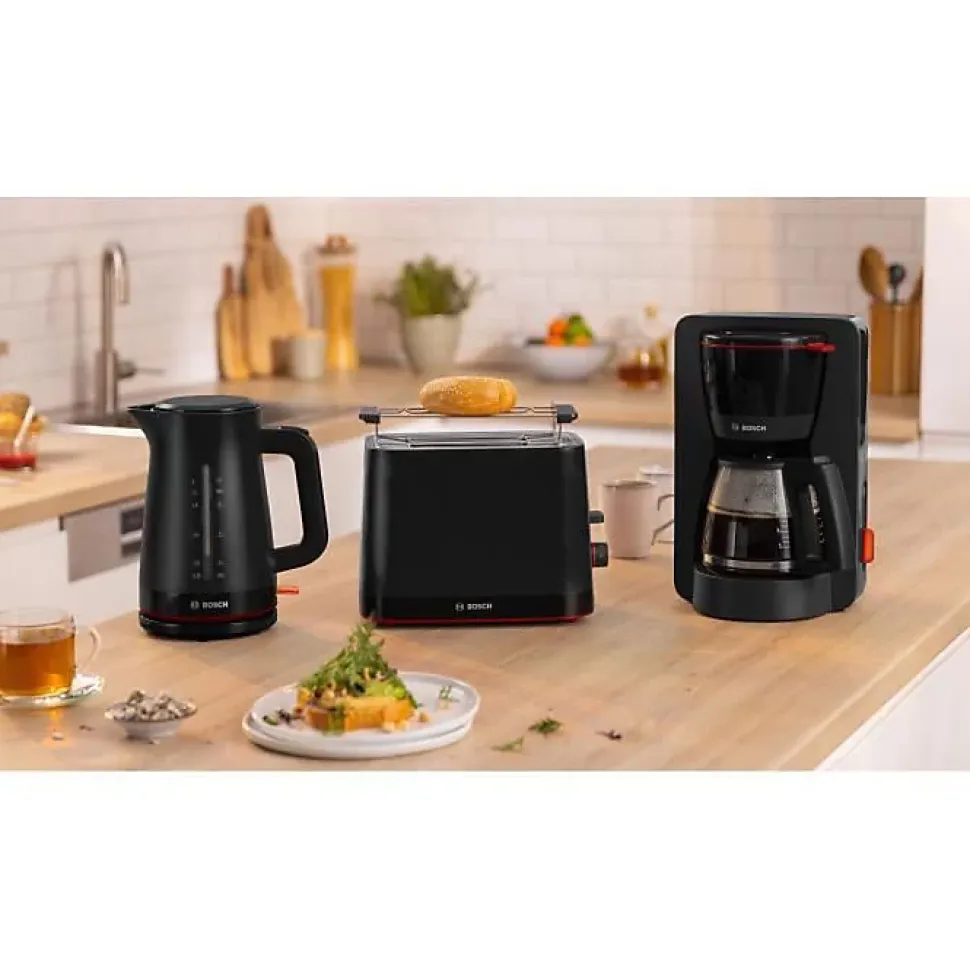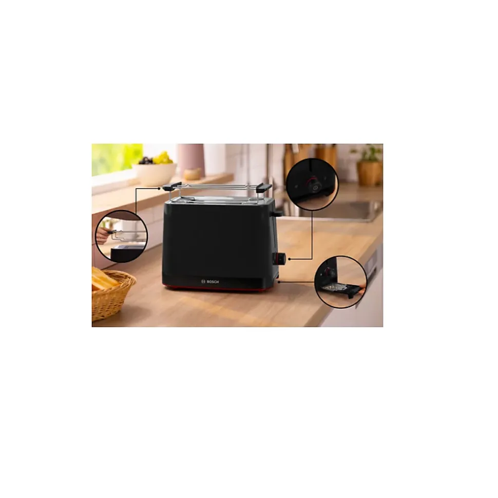Grille-pain BOSCH TAT3M123, design compact noir avec fonction décongélation, réchauffage, thermostat variable, 2 tranches, puissance 950 W, système HighLift, bac à miettes amovible, cordon de 1 m.