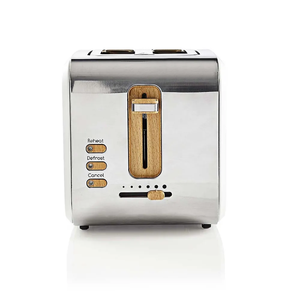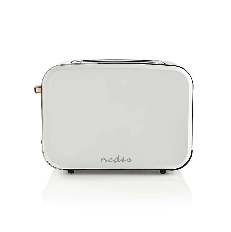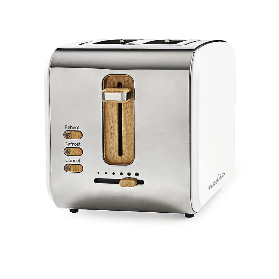 Description du produitGrâce à ses fentes extra-larges, ce grille-pain électrique Nedis grille parfaitement le pain prétranché, le pain coupé à la main, les bagels ou les muffins.Les six modes différents et les boutons d’annulation, de réchauffage et de décongélation vous permettent d’avoir un contrôle parfait.Avec son tiroir à miettes amovible, cet élégant grille-pain est simple à entretenir et toujours impeccable.Combinant l’acier inoxydable avec la finition du bois et du caoutchouc, cet appareil électroménager est aussi beau que fonctionnel.CaractéristiquesDeux fentes extra-larges : pour griller toutes les épaisseurs de painSix réglages différents : préparez vos toasts exactement comme vous les aimezAvec fonctions de réchauffage, décongélation et annulationPlateau ramasse-miettes amovible : pour faciliter le nettoyageContenu de l’emballageGrille-painManuelSpécificationsBouton d’éjection: OuiConsommation électrique maximale: 900 WCouleur: BlancEspace de rangement du cordon: OuiFiche d’alimentation: Type F (CEE 7/7)Fonction de dégivrage: OuiLargeur: 290 mmLongueur: 180 mmLongueur du câble d’alimentation: 0.80 mMatériau: AcierNombre de slots: 2 EmplacementsPieds antidérapants: OuiPince à pain: NonPlateau ramasse-miettes amovible: OuiPoids: 1700 gSDA Series: Série Soft TouchSupport à pain: NonTaille: 200 mmTension d’entrée: 220 – 240 V AC 50/60 HzThermostat réglable: 6Type de source d’alimentation: Alimentation secteurVoyant: Oui