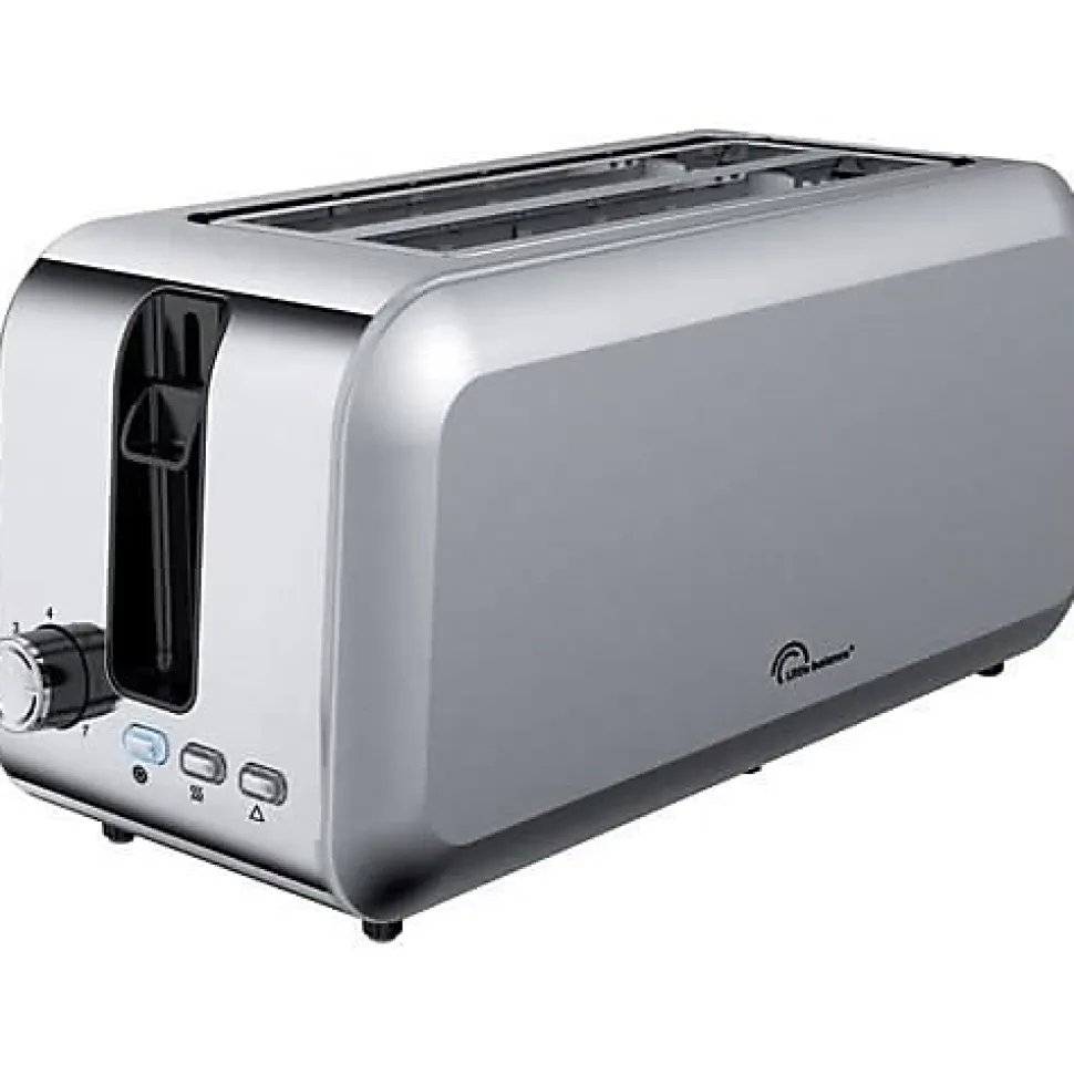 Parfait pour griller tous types de pains : baguette, pain de campagne, toasts, etc… – Grillage rapide grâce à sa puissance – 2 fentes longues de 23.7 cm pour accueillir 2 longs morceaux de baguette ou 2 grandes tranches de pain de campagne ou encore 4 toasts – Thermostat réglable 7 niveaux – 3 touches fonctions avec témoins LED : Réchauffage, Décongélation et Arrêt manuel – Système de remontée haute du pain pour saisir les petits morceaux de pain sans se brûler – Éjection automatique en fin de cuisson – Tiroir ramasse-miettes amovible – Range-cordon – Corps en acier inoxydable anti-chaleur – Garantie 2 ans.