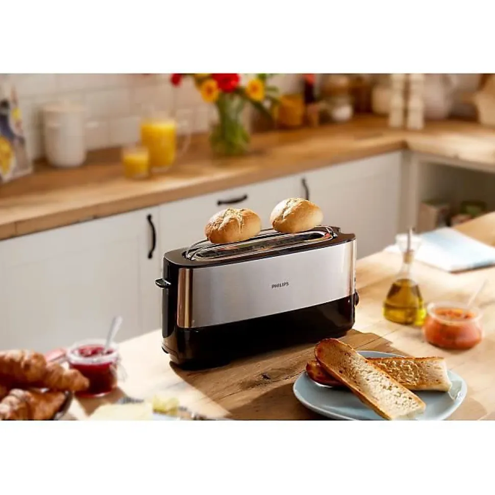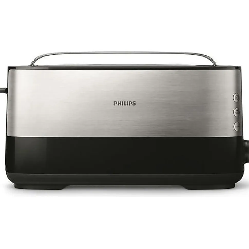 Grille-pain Philips Viva Collection HD2692/90, puissance 1030 W, design métal noir et inox, fente extra-large pour tous types de pains, 8 niveaux de dorage avec fonction décongélation et réchauffage, grille chauffante intégrée, sécurité renforcée avec parois froides et arrêt automatique, levier surélevé, bac à miettes amovible, garanti 2 ans.