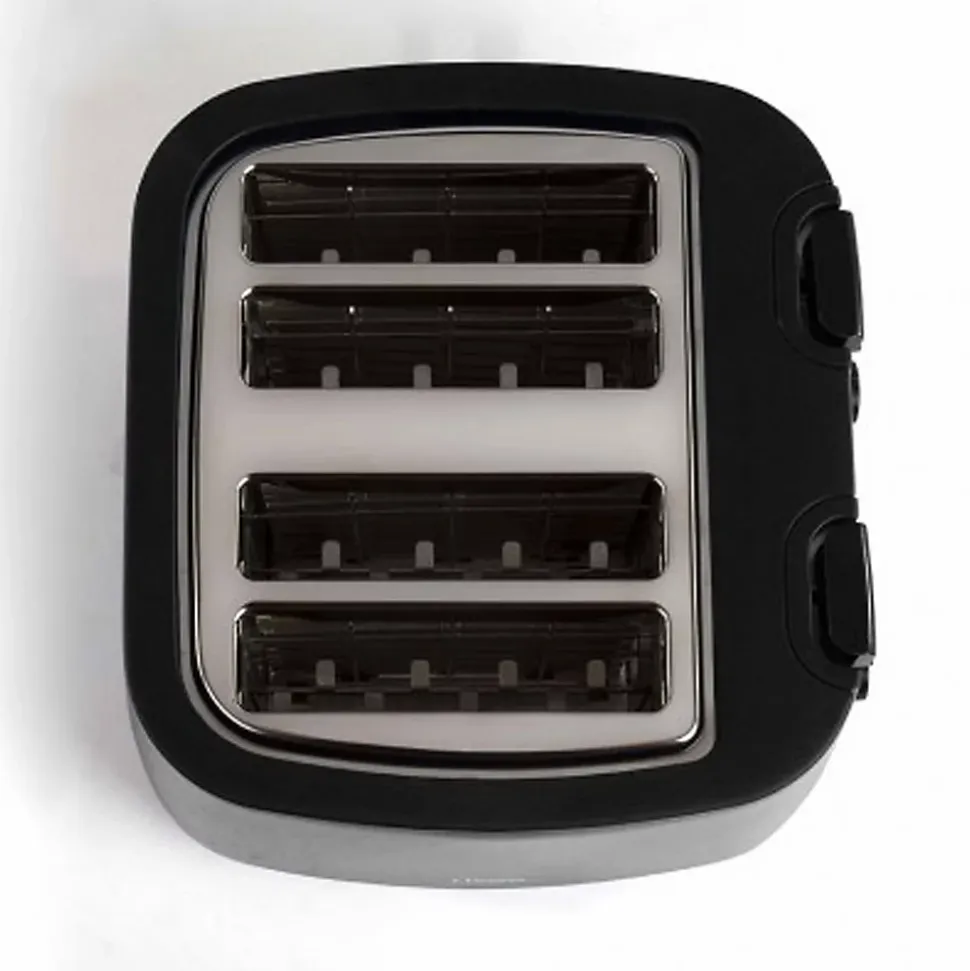 Un grille-pain maxi capacité :Ce grille-pain permet de faire griller rapidement de nombreuses tranches de pain puisque l’appareil dispose de 4 fentes. Sa couleur noire, sobre et élégante s’accordera dans n’importe quelle cuisine.Deux thermostats indépendants :Le modèle dispose de deux thermostats indépendants ce qui permet d’ajuster la température et de faire griller différentes sortes de pain en même temps.L’appareil permet de décongeler directement des tranches sorties du congélateur, de réchauffer du pain et d’arrêter manuellement l’appareil.Les 7 positions du thermostat permettent d’obtenir un pain légèrement ou bien doré selon vos préférences.Le tout sans miettes :Amovible, le tiroir ramasse-miettes est pratique et facile à nettoyer. Fini les miettes qui traînent sur le plan de travail de la cuisine.Avantages principaux :- Grille-pain 4 fentes- Puissance : 1500W- Fonctions arrêt manuel, réchauffage et décongélation- Thermostat réglable : 7 positions- Ejection automatique- Tiroir ramasse-miettes- Parois froides…