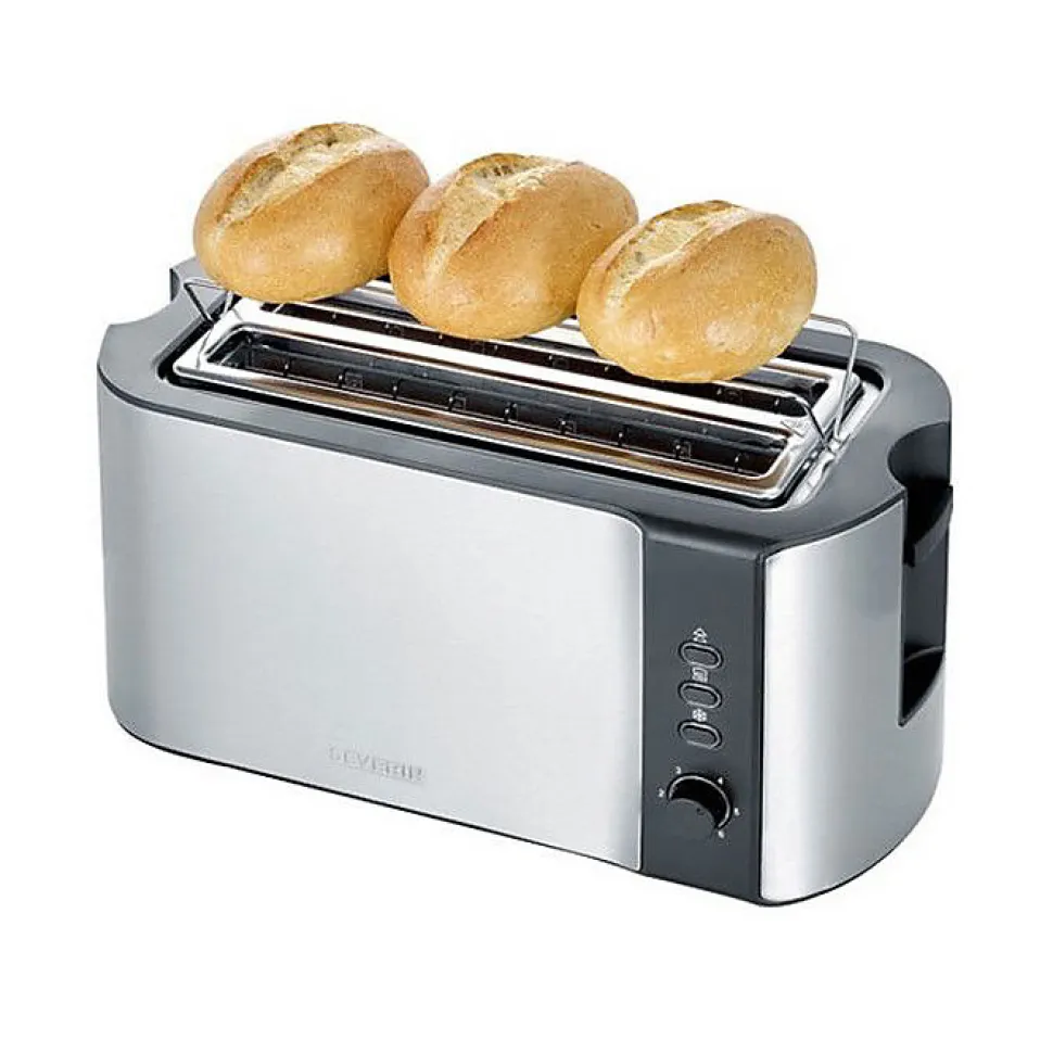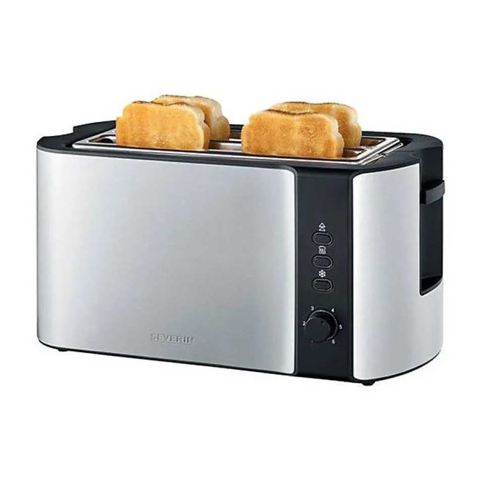 Grille-pain Severin AT 2590 – performance et praticité au quotidien : centrage automatique pour un brunissage homogène, fentes extra-longues pour griller plus à la fois, grille spéciale viennoiseries intégrée, thermostat électronique réglable, fonctions décongélation et réchauffage avec témoins lumineux, boîtier inox isolé et ramasse-miettes amovible.