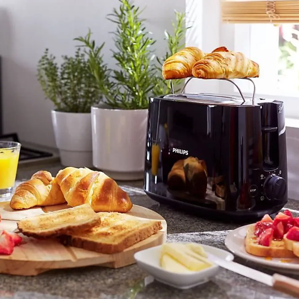 Grille-pains 2 fentes 830w noir Philips – Ce grille-pain compact Philips HD2581/90 offre 8 réglages et 2 grandes fentes à largeur variable, pour un dorage parfait, quel que soit le type de pain utilisé. Le réchauffe-viennoiseries intégré vous permet de réchauffer vos petits pains, pâtisseries et brioches facilement.8 niveaux de dorage, pour un pain grillé comme vous l’aimezLes 8 réglages vous permettent de griller différents types de pain sans risquer de les brûler. Sélectionnez le niveau de dorage de votre choix, pour du pain grillé comme vous l’aimez.2 grandes fentes à largeur variable pour différentes tailles de pain. Le système de centrage automatique du pain permet un dorage uniforme sur les deux faces.Accessoire réchauffe-viennoiseries intégré pour réchauffer petits pains, pâtisseries et brioches facilement.La fonction réchauffage réchauffe le pain grillé en quelques secondes, tandis que la fonction décongélation grille directement le pain congelé.Arrêtez à n’importe quel moment en appuyant sur le bouton arrêt.Facile à nettoyer grâce au ramasse-miettes amovible.Fonction surélevage pour un retrait facile des petites tranches de pain.L’arrêt automatique protège le produit contre les courts-circuits. – Puissance : 8300 W.Nombre de fentes : 2.Nombre de niveaux de dorage : 8.Mode d’emploi : 100% de papier recyclé.Couleur : Noir.Matériau du corps de l’appareil : Plastique.Fréquence : 50-60 Hz.Alimentation : 830 W.Tension : 220-240 volt.Fabriqué en : Chine.Dorage ajustable : Oui.Arrêt automatique : Oui.Bouton éjection : Oui.Parois froides : Oui.Fonction décongélation : Oui.Surélevage : Oui.Rangement du cordon intégré : Oui.Dimensions du produit (Lxlxh) : 27,5×15,6×18,8 cm.Poids : 1,1 Kg.