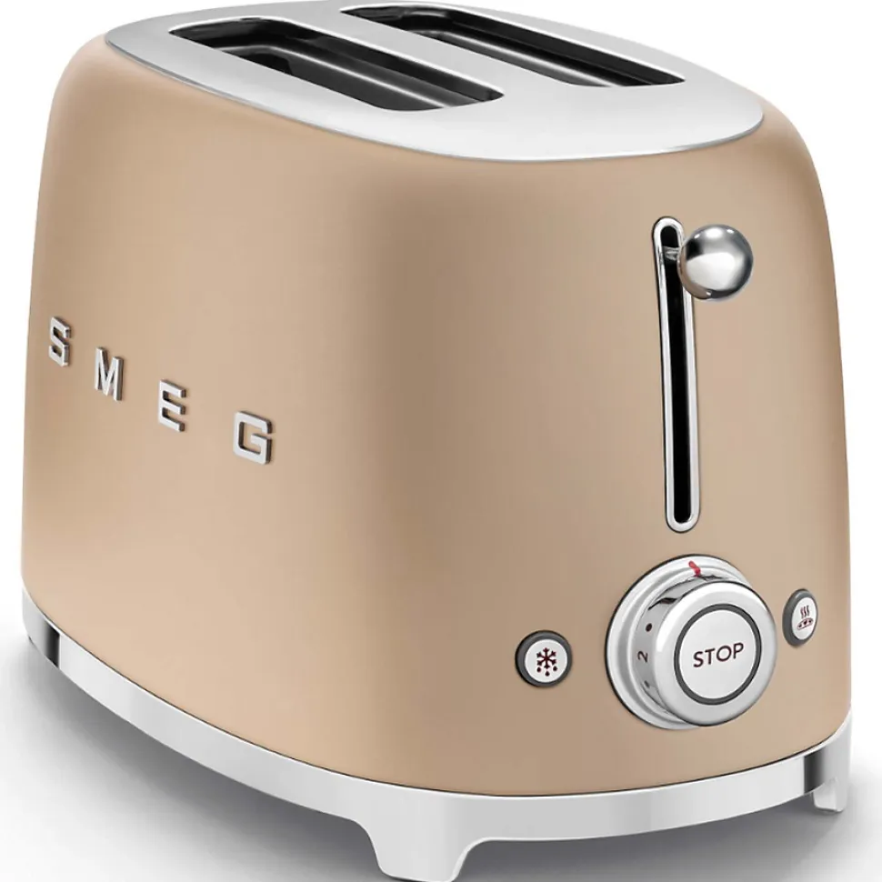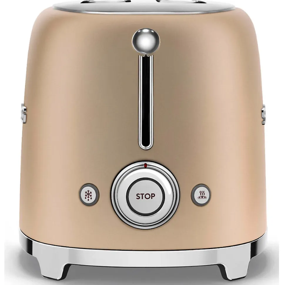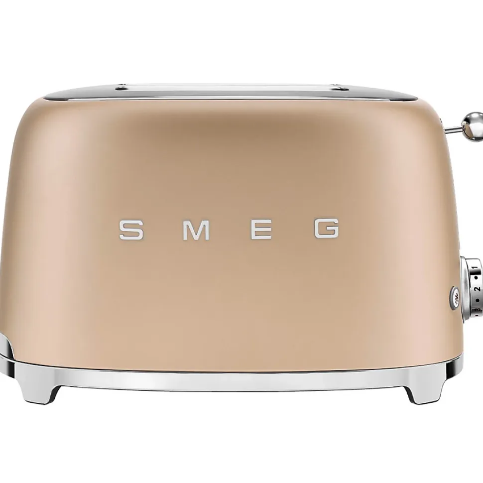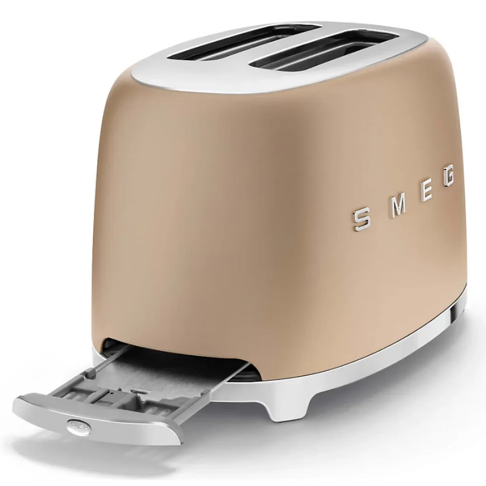 Grille-pains 2 fentes 950w or mat Smeg – Grille-pains Années 50 Smeg TSF01CHMEU doté de 3 programmes préréglés : réchauffage, décongélation, bagel. Tiroir ramasse-miettes en acier, amovible pour nettoyage aisé. – Type de produit : Grille-pains.Puissance (W) : 950.Nombre de fentes : 2.Fentes Extra Larges : Oui.Fentes Longues : Non.Fentes Extra Profondes : Non.Largeur de Fente Variable : Non.Éjection du pain : Automatique.Centrage automatique du pain : Oui.Matière du Corps de l’Appareil : Structure en acier / Base chromée.Couleur(s) secondaire(s) : Chrome.Finition / Nuance : Mat.Fonction Décongélation : Oui.Fonction Réchauffage : Oui.Autre(s) fonction(s) : Bagel.Thermostat : Oui (6 positions).Touche d’Ejection : Oui.Tiroir ramasse miettes : Oui.Emplacement Range Cordon : Oui.Autre(s) : Prise Schuko fournie, manette de commande chromée rétro-éclairée, levier de contrôle en acier inox.Type d’Ecran Electronique : Non.Parois froides : Non.Autre(s) sécurité(s) : Pieds antidérapants.Alimentation : 220 – 240 V.Fréquence : 50 – 60 Hz.Dimensions (cm) : 19.8 x 32.5 x 19.5.Longueur du cordon (m) : 1.Largeur de la fente (cm) : 3.6.Couleur : Or.Poids net (kg) : 2.45.