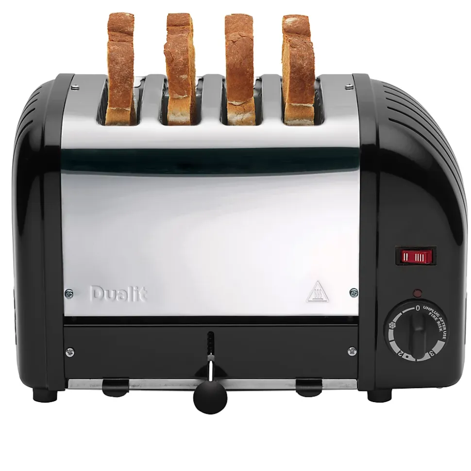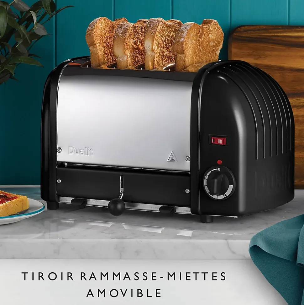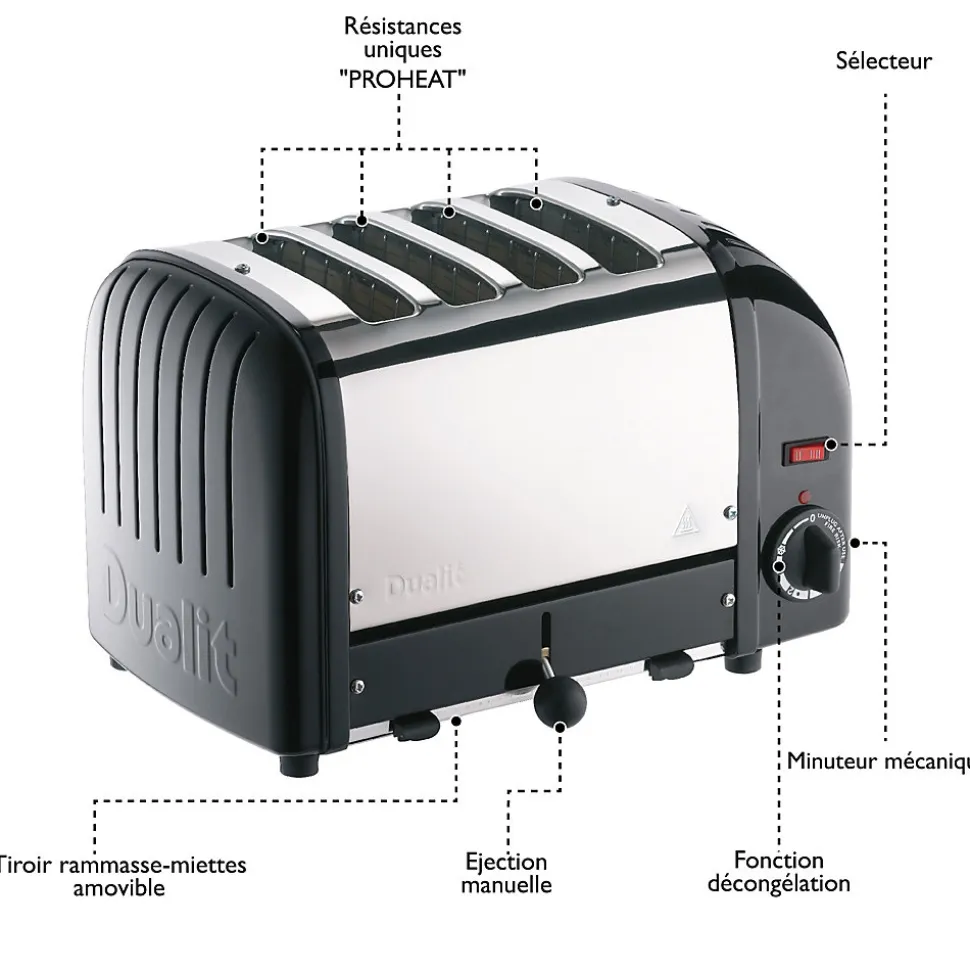 Grille-pains 4 fentes 2200w noir mat Dualit – Le grille-pains 4 fentes Vario 40357 de DUALIT est parfait pour toute la famille. Il offre tout le style et la fonctionnalité que vous attendez d’un grille-pains Dualit, ainsi qu’une fonction décongélation, la minuterie mécanique et levier d’éjection. Le sélecteur de commande vous permet de chauffer deux fentes, ou les quatre simultanément. – Puissance : 2200 W.Capacité : 1 à 4 tranches.Tiroir ramasse miettes.Fonction décongélation.Fonction peek and pop : permet de vérifier la cuisson du pain sans interrompre le cycle de chauffe.Résistances ProHeat.Fentes extra larges 28 mm.Utilisé dans les cuisines commerciales, il est résistant, durable et solide qualité de l’ingénierie.Contrôle fente sélecteur éconergétique vous permet de ne toasts ce que vous avez besoin.Minuterie mécanique vous permet de contrôler vos préférences de brunissement.Levier d’éjection à commande manuelle vous permet de vérifier le pain tout en grillant.Pied arrière réglable pour compenser les surfaces inégales.130 toasts par heure.Pièces remplaçables.Matériaux: extrémités en aluminium coulé, corps en acier inoxydable.Dimensions : 36 x 21 x 22 cm.Poids : 3.8 kg.Couleur : Noir MatFabriqué à la main au Royaume-Uni.