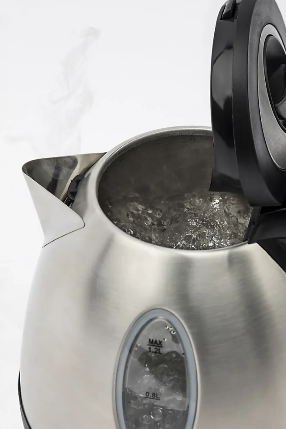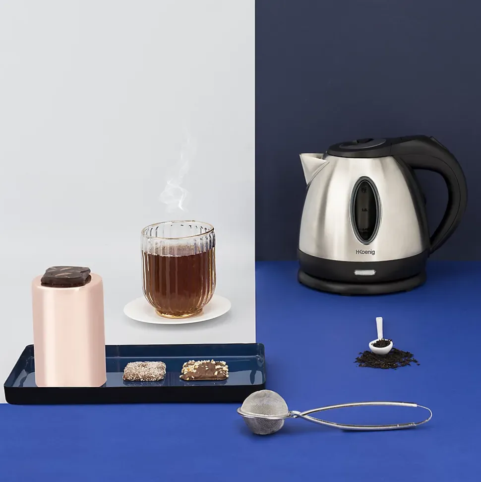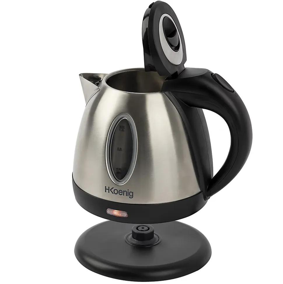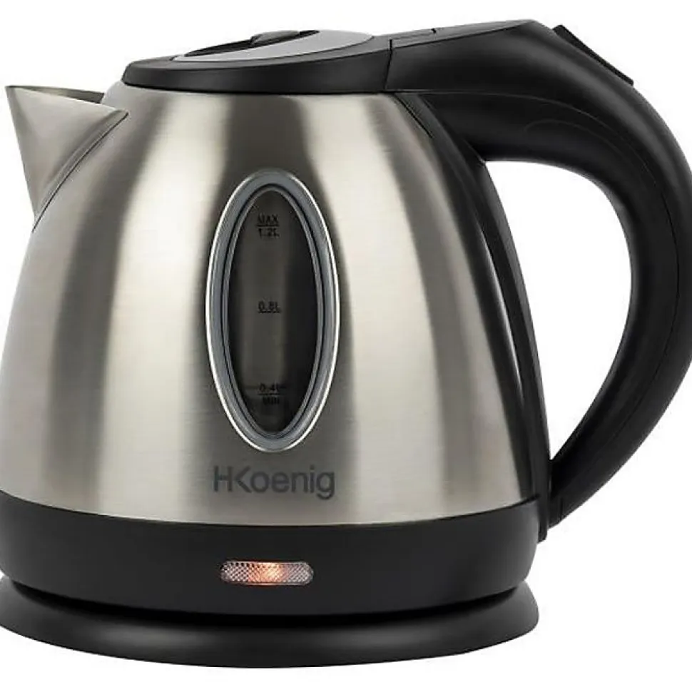 Bouilloire électrique H.Koenig BO12 avec design épuré, sans fil, 1,2 litres, 1630 watts, socle rotatif 360°, arrêt automatique, inox durable, pieds anti-glissants et indicateur lumineux. Idéale pour un usage quotidien.