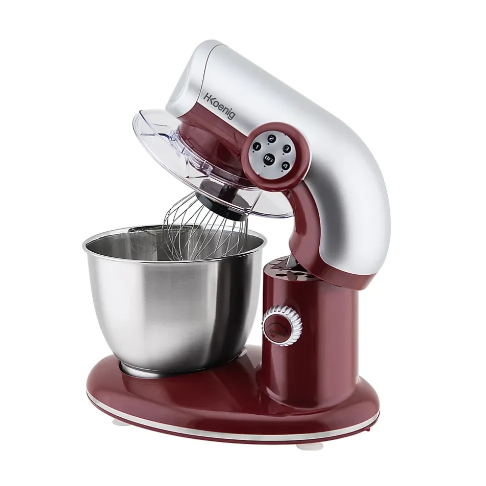 DESCRIPTION :Avec sa grande capacité de 5 litres soit 2 kg de pâte et sa puissance de 1000 watts, le robot pétrin KM80 vous permettra de réaliser vos préparations en toute simplicité.Efficace, l’appareil est doté de 4 vitesses pour s’adapter à tous vos besoins.Pratique et élégant, son design en inox avec sa tête inclinable facilite l’accès au bol mixeur. Le couvercle antiéclaboussures vous facilite le nettoyage.Pour plus de possibilités, le produit est fournis avec 3 accessoires (fouet, batteur et un crochet pétrin) pour préparer des centaines de recettes.Décuplez les fonctionnalités de votre produit en achetant ses accessoires optionnels AC8 qui se fixent sur le devant du bras.Adaptez-le au design de votre intérieur, il est disponible en trois couleurs: noir, rouge et gris.Réussissez toutes vos recettes avec le KM80 de H.Koenig!CARACTÉRISTIQUES :Grand récipient en acier inoxydable Capacité : 5,5 LJusqu’à 2 kg de pâteCouvercle anti éclaboussures4 vitessesDesign tête inclinable Accessoires : fouet, batteur, crochet pétrisseurPuissance : 1000 WProduit associé : AC8Trois couleurs disponibles : noir, rouge, gris