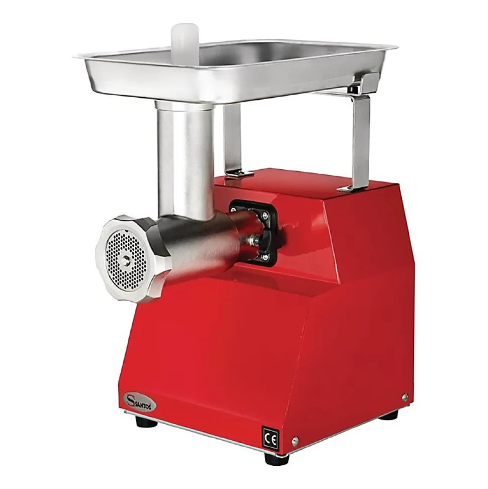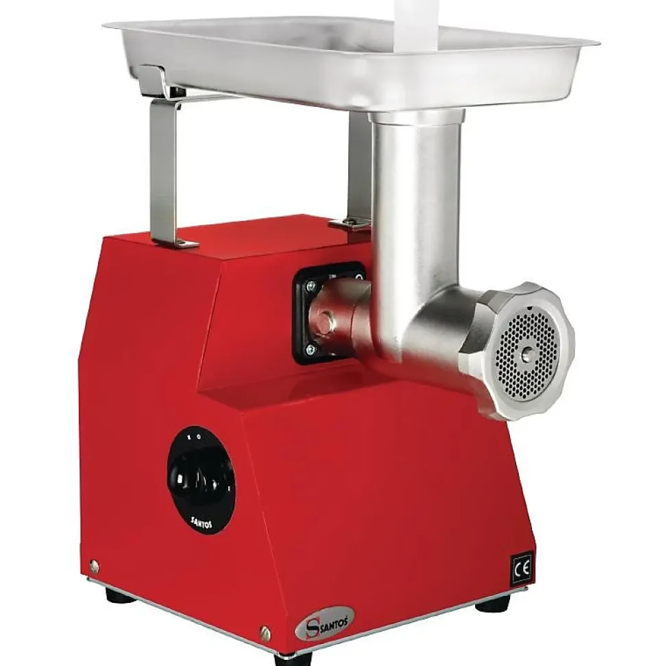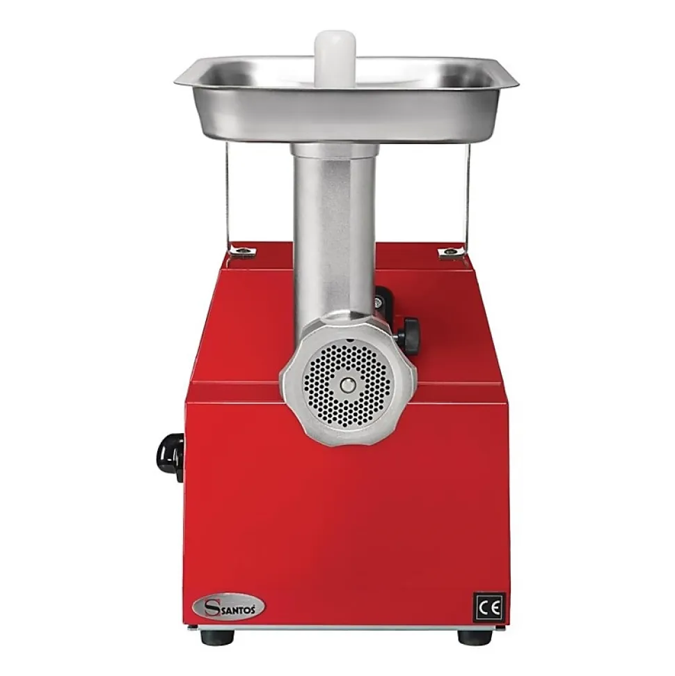 Hachoir à viande professionnel avec une capacité de 160kg/h de la marque Santos Robuste hachoir à viande en acier inoxydable pour tout type de viande, y compris les grosses, moyennes et fines. Idéal pour les hamburgers, les saucisses et pâtés.Caractéristiques:Marque: SantosDimensions: 420(H) x 260(L) x 330(P)mmMatériel: Acier inoxydableRendement: Débit moyen : 160 kg/heurePuissance: 230V. 650W. 3.5A. Min IPx3Vitesse: 1800 rpmAlimentation: 230VPoids: 18 kgPrise: ouiLivré avec trois disques : 3mm, 4,5 mm, et 8mmHachoir à viande professionnel avec le corps en acier inoxydableMoteur synchrone (5 ans de garantie)Bouton d’inversion du sens de rotation (Marche arrière)Longue durée de vitesse – pas de graissage nécessaireSystème de verrouillage rapideToutes les pièces amovibles passent au lave-vaisselleConforme HACCPRéférence soumise à une Eco-participation DEEE de 0,72€ par unité vendue
