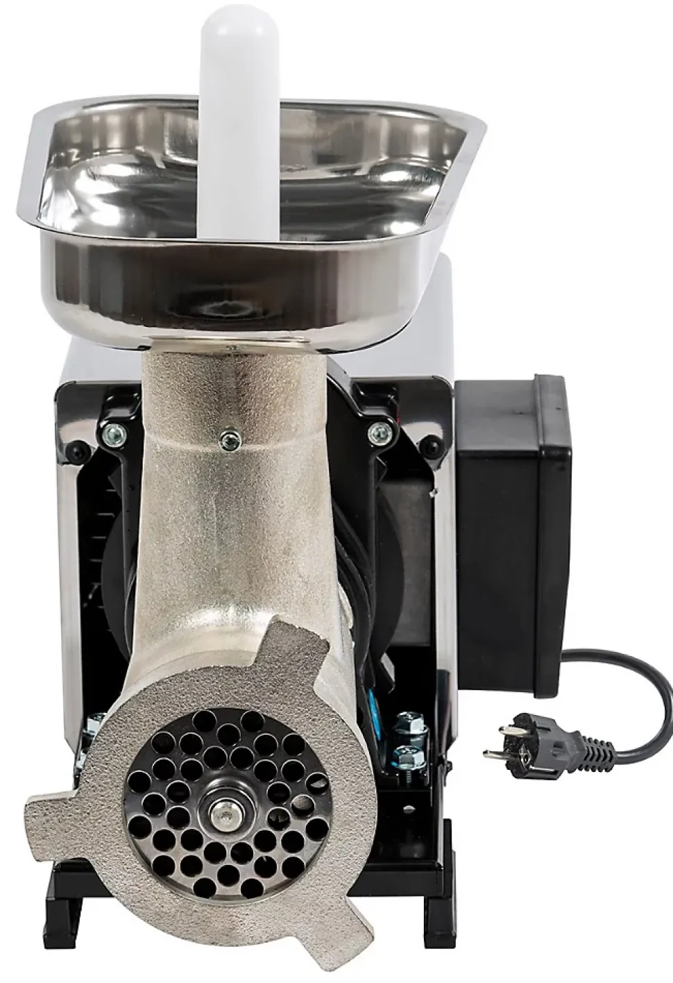 Le hachoir à viande N°32 Reber est destinée aux professionnels (boucheries, charcuteries, traiteurs) souhaitant du matériel qualitatif et résistant pour la réalisation de leurs hachis ou de leurs farces. Il permet également de répondre aux besoins des éleveurs dans le cadre de la transformation de la viande à la ferme. Production à l’heure entre 100 et 160 kg. Nettoyage facile et rapide. Fabrication italienne. Tous les produits sont testés chez le fabriquant. Ce hachoir est livré avec une grille percée de trous de Ø 10 mm. D’autres grilles sont disponibles en option (4.5 mm, 6 mm, 8 mm, 12 mm). Le hachoir à viande N°32 Reber se compose des éléments suivants : Moteur à induction à fonctionnement continu Réducteur à bain d’huile, huile de type Long Life, conforme au contact avec les aliments. Carénage en acier inoxydable AISI 430 Corps, hélice, écrou en fonte étamée certifiée alimentaire Plaque supérieure en acier inox AISI 304 Interrupteur d’inversion d’impulsions Tôle en acier et couteau en acier C55 en standard Caractéristiques : Puissance du moteur : 1200W Dimensions : 58 x 25,5 cm Hauteur : 36 cm Poids 29,3 kg Production horaire : 100-160 kg Indiqué aussi pour faire des saucisses Conseils d’utilisation : Il est impératif de sécher de suite les éléments après nettoyage pour ne pas avoir de traces de rouilles sur la fonte. Nous préconisons de sécher l’entonnoir avec un sèche-cheveux. De plus, pour prolonger la durabilité de vos couteaux, nous suggérons de graisser régulièrement les pivots à l’huile (huile de tournesol) et surtout de ne pas nettoyer les nettoyer avec des détergents agressifs. Nécessite un entretien de l’huile ou un remplacement/remplissage tous les 3