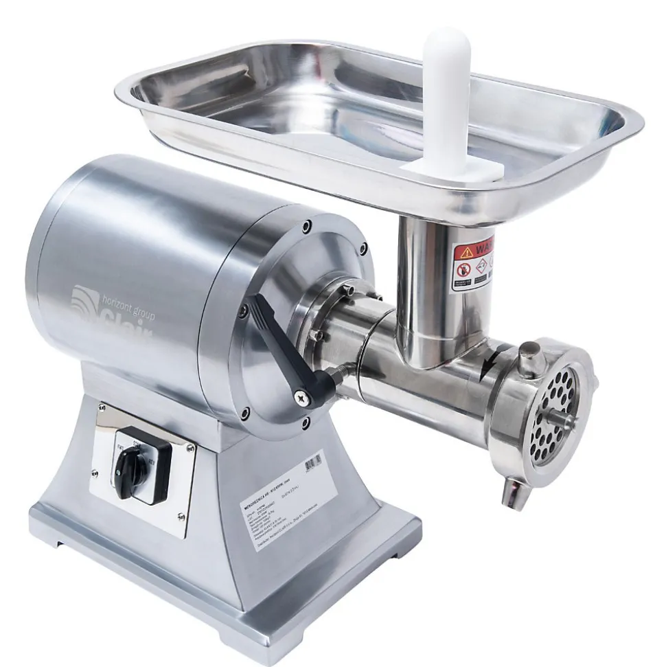 Le hachoir à viande N12 est le modèle idéal pour les professionnels recherchant un appareil fiable, robuste et facile à utiliser dans un format compact. Sa transmission par engrenage entièrement fermée garantit un fonctionnement régulier et un entretien minimal. Équipé d’accessoires en acier inoxydable amovibles, il assure une hygiène parfaite et un nettoyage simplifié.Sa tête amovible et sa poignée latérale facilitent la manutention, tandis que son design soigné sans interstices empêche toute accumulation de résidus. Grâce à son bouton unique avec fonction inversion, son utilisation est intuitive et accessible à tous. Offrant un excellent rapport qualité-prix, il se positionne comme un outil indispensable pour les besoins de hachage réguliers. Caractéristiques : Puissance : 650 W Production horaire : 150 kg/h Dimensions L × l × H : 43,8 × 21 × 38,7 cm Poids : 19,5 kg Grille : trous de 8 mm Matériaux : corps en aluminium, plateau et tête en inox Conforme aux normes alimentaires