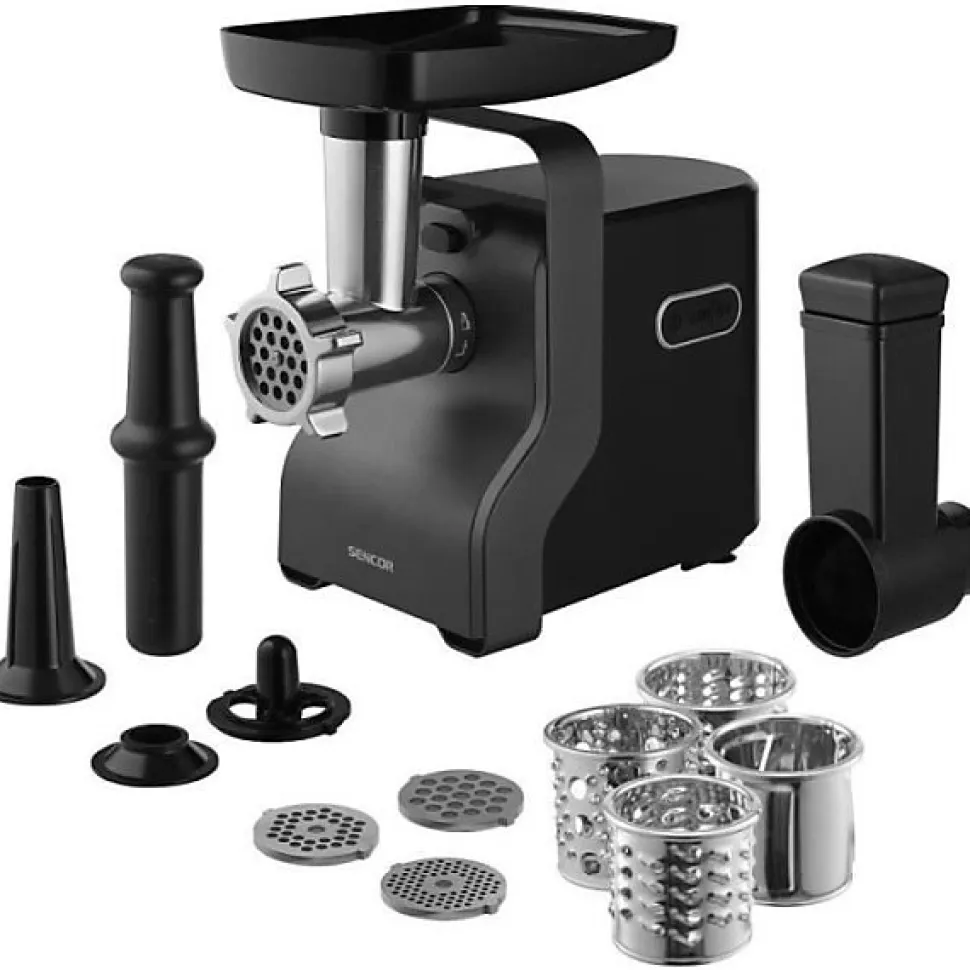 Hachoir électrique SENCOR SMG 5400BK — 700 W (2100 W max), débit 1,7 kg/min, 3 disques (3/5/7 mm), poussoir saucisses, râpes multifonctions et pieds antidérapants. Lames et disques en acier durable, bac résistant. Design noir et argent.