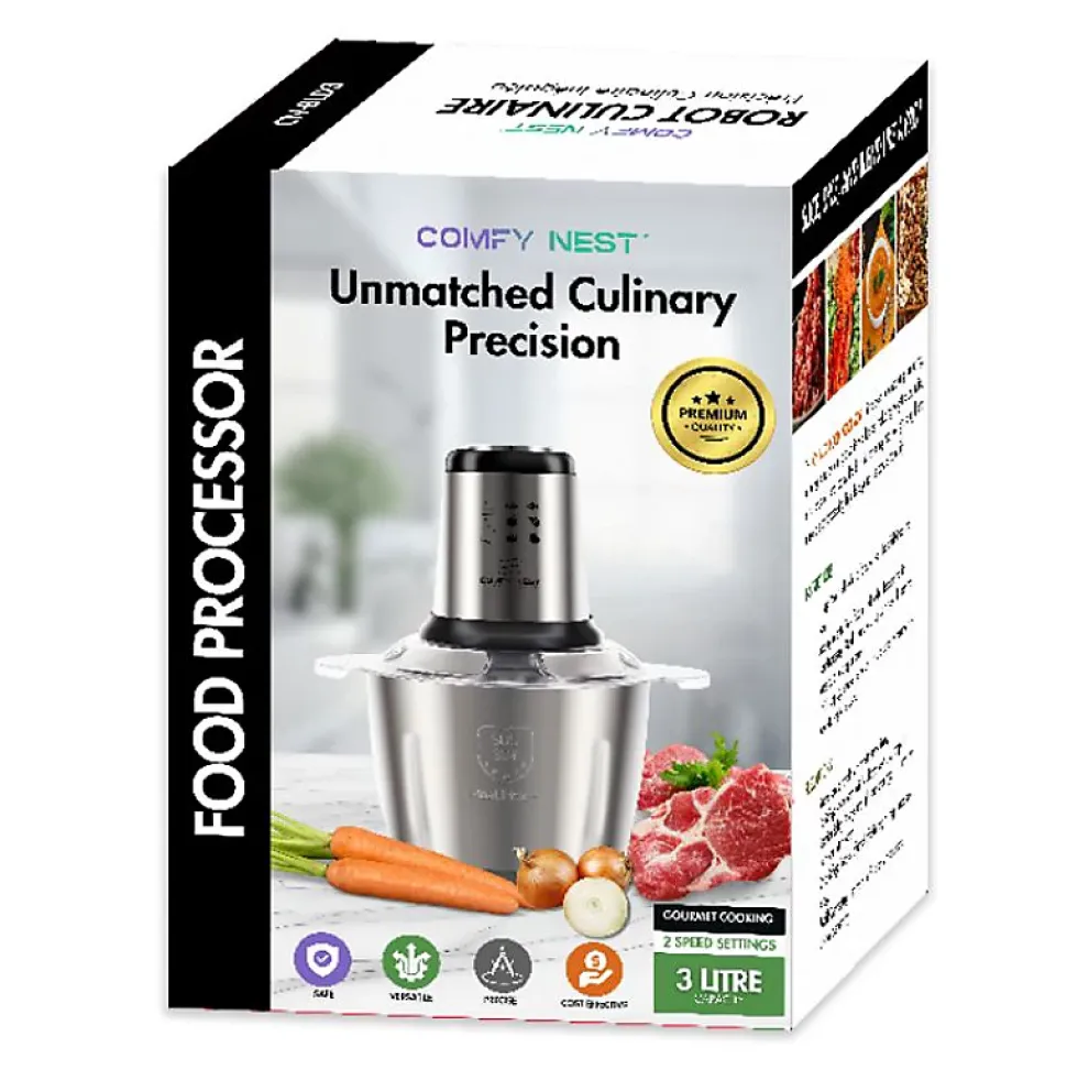 Le robot culinaire multifonction Comfy Nest CNBLD3. 3L est un appareil de cuisine polyvalent conçu pour simplifier la préparation des aliments. Avec une capacité de 3 litres et une puissance nominale de 1000 W, ce robot culinaire est parfait pour hacher rapidement des légumes, des fruits, des viandes et d’autres ingrédients. Sa conception conviviale le rend idéal pour préparer des garnitures pour boulettes, petits pains, tartes ou même des salades de fruits et des aliments sains pour bébé. L’appareil offre une flexibilité en permettant aux utilisateurs de contrôler la taille et la texture des ingrédients hachés en fonction des préférences personnelles, ce qui en fait un outil essentiel pour les cuisiniers à domicile.L’une des caractéristiques remarquables de ce robot culinaire est sa large gamme d’applications. De la création rapide de garnitures pour boulettes et petits pains à la préparation de salades de fruits nutritives et de délicieux milkshakes, il répond aux divers besoins des repas de famille. Il est particulièrement pratique pour les parents qui préparent des compléments alimentaires sains pour bébé et pour créer de savoureuses friandises comme des milkshakes. La commodité du robot culinaire s’étend à sa facilité de nettoyage, grâce à ses pièces détachables et à sa conception de séparation des tasses. Cela rend la préparation et le nettoyage efficaces et sans stress.De plus, le Comfy Nest CNBLD3 bénéficie d’un design compact et pratique avec un double couvercle qui permet un stockage immédiat après utilisation, préservant ainsi la fraîcheur. Il est économe en énergie avec une cote énergétique A+ et comprend des fonctions de sécurité comme un temps de pressage recommandé de 3 à 5 secondes, garantissant des performances optimales sans surchauffe. Parfait pour les familles ou comme cadeau attentionné, ce robot culinaire multifonctionnel apporte commodité, rapidité et polyvalence à la cuisine, rendant les tâches de cuisine quotidiennes plu
