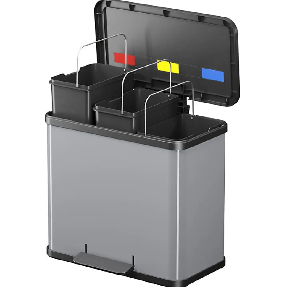 Poubelle à pédale Hailo Oko Trio Plus Taille L avec trois bacs intérieurs amovibles de 9 litres chacun, boîtier en acier inoxydable ou tôle recouverte, couvercle en plastique noir avec fermeture douce, large pédale ergonomique, idéale pour le tri sélectif à la maison ou au bureau. Dimensions : 47 x 34 x 44 cm. Poids : 4,7 kg.
