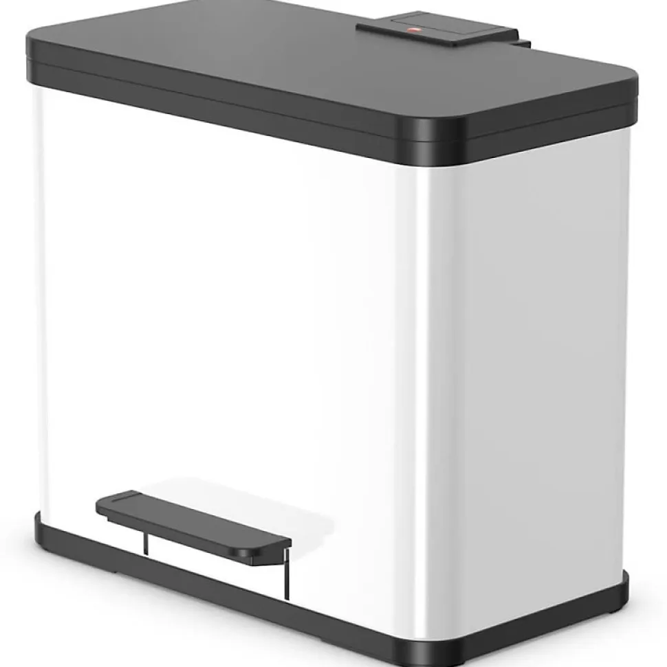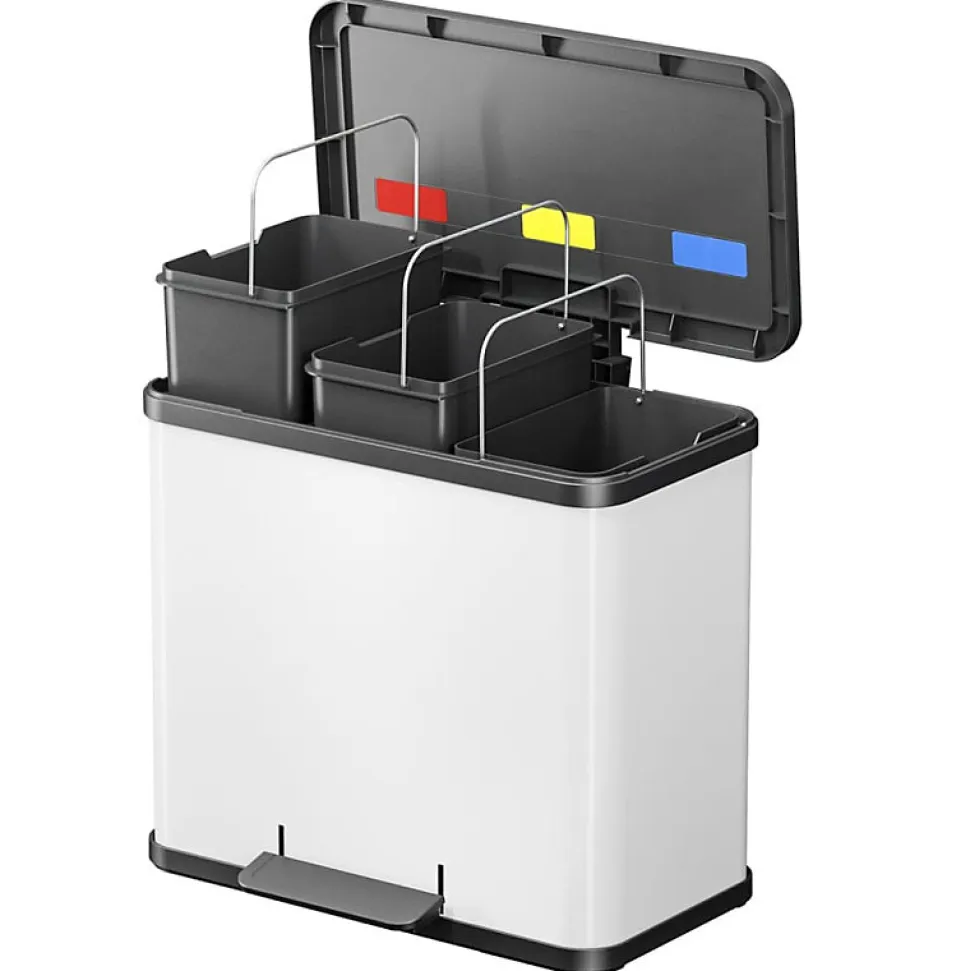 Poubelle à pédale Öko Trio Plus L – Tri sélectif intelligentLa poubelle Öko Trio Plus L en blanc mat allie design moderne et fonctionnalité économe en énergie. Avec ses 3 bacs internes de 9 litres chacun, elle facilite le tri des déchets tout en s’intégrant parfaitement dans les cuisines contemporaines. Son mécanisme à pédale ergonomique garantit une ouverture hygiénique sans contact.Mécanisme silencieux et matériaux durablesÉquipée d’un système Soft Close, la fermeture amortie du couvercle élimine les bruits désagréables. Les bacs internes en plastique 100% recyclé (couleurs standardisées selon les normes de tri) et la structure en acier laqué résistent aux chocs tout en réduisant l’empreinte liée à la consommation de ressources.Dimensions optimisées pour un usage quotidienAvec ses 43 cm de hauteur, 47 cm de largeur et 34 cm de profondeur, cette poubelle trouve sa place même dans les espaces restreints. Son poids de 3,9 kg et ses poignées intégrées permettent un nettoyage aisé et un déplacement sans effort.Garantie et praticité renforcéeLa housse de protection en acier blanc mat résiste aux rayures et aux projections. La garantie de 5 ans pour usage privé assure une longévité exceptionnelle, tandis que le système de serrage intégré pour sacs poubelles simplifie le remplacement.Tri sélectif 3×9 litres avec bacs amovibles en plastique recycléMécanisme à pédale ergonomique et ouverture mains libresFermeture amortie Soft Close pour un usage silencieuxStructure en acier laqué blanc résistant aux chocsGarantie constructeur de 5 ans pour usage domestique