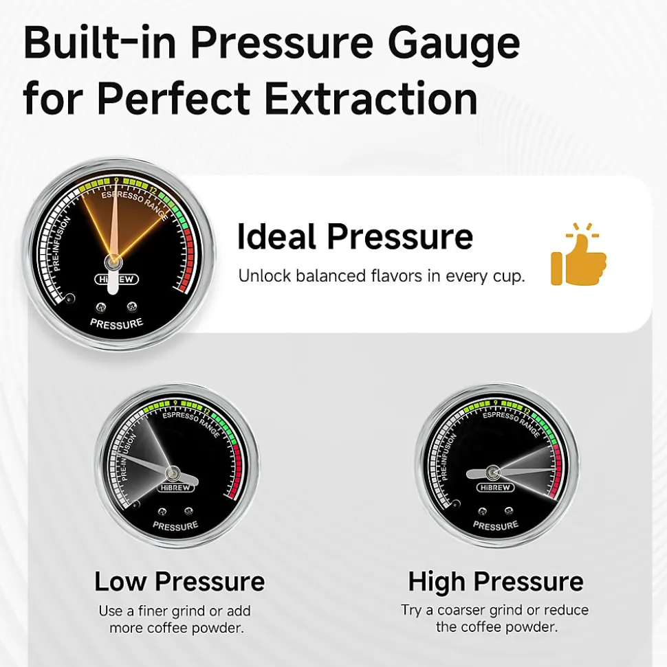 ✅ Pression de 20 Bars : La machine à espresso HiBREW H10A utilise une puissante pompe haute pression de 20 bars et une technologie de pré-infusion uniforme pour garantir une extraction optimale de la crema du café. Son corps en acier inoxydable brossé est robuste, stable, résistant aux salissures et facile à nettoyer.✅ Fonctions Programmables Professionnelles : Cette machine à espresso semi-automatique permet d’ajuster la quantité de café, la température d’extraction, la température de la vapeur et le temps de pré-infusion. Grâce à ses nombreuses fonctions de programmation, vous pouvez personnaliser l’acidité et l’amertume de votre café, même avec des grains de différentes saveurs.✅ Gamme de Programmes Optionnels : Elle offre une capacité de tasse simple de 35 à 150 ml et une capacité double de 70 à 300 ml. La température d’extraction chaude varie de 90 à 95 °C, tandis que la température froide est de 25 °C. La température de la vapeur est réglable entre 125 et 150 °C, et le temps de pré-infusion peut être ajusté de 0 à 10 secondes. Les affichages de température peuvent être convertis entre Celsius et Fahrenheit.✅ Système de Vapeur Puissant : La machine est équipée d’une buse à vapeur rotative à 270 degrés pour réaliser de la mousse de lait. La vapeur haute pression à 125-150 °C produit rapidement une mousse de lait dense, augmentant le succès des arts du latte. Le design détachable de la tête de vapeur facilite le nettoyage pour éviter les obstructions et la corrosion du lait.✅ Système de Chauffage à Thermo Coil & Fonction de Tasse Chaude : L’intérieur de la machine utilise un design en thermo coil en acier inoxydable de 53 cm pour stabiliser la température de l’eau dans la chaudière, évitant la rouille des tuyaux internes et garantissant la pureté de chaque tasse. Le dessus de la machine dispose d’une fonction de réchauffage des tasses, permettant de garder les tasses chaudes après les avoir rincées à l’eau chaude.