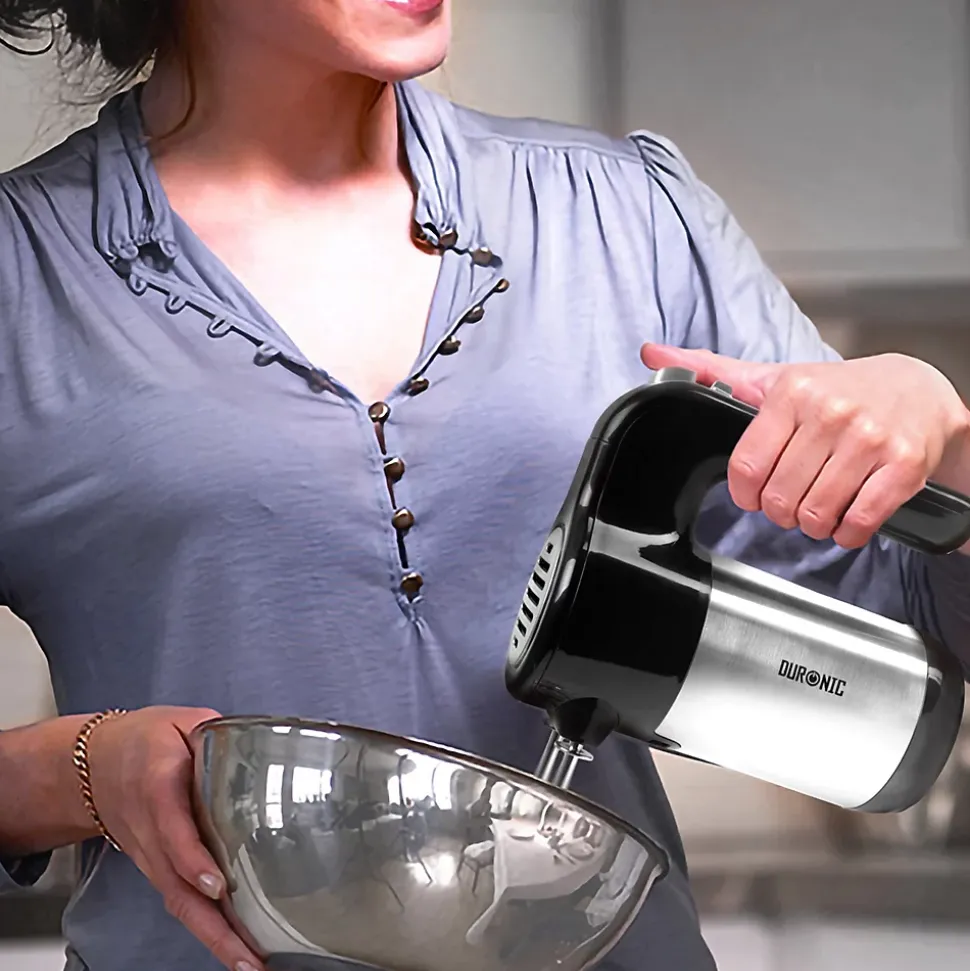 Le batteur à main HM3 de Duronic est un outil de cuisine indispensable pour tout amoureux de cuisine et de pâtisserie. Légèreté et ergonomie ont été mises en avant pour jouir d’un appareil puissant de 300W.L’appareil est livré avec tous les accessoires traditionnels, tels que deux crochets à pétrir et deux batteurs. Facilement démontable grâce à la touche dédiée, ils resteront également parfaitement en place en fonctionnement. Ces accessoires permettent de pétrir de la pâte, battre des œufs en neige, mélanger votre pâte à crêpes ou tout autre recette favorite nécessitant un mélange homogène.Ce batteur à main bénéficie d’un moteur de 300W qui fournit toute la puissance nécessaire par le biais des 5 vitesses disponibles et de la fonction turbo. Cette puissance garantit des performances inégalées en toutes circonstances et la réalisation sans effort de recettes simples ou complexes. Accessoire indispensable pour préparer vos gâteaux et autres pâtisseries, cet appareil est garanti sans BPA.Compact et facile à ranger, l’appareil ainsi que ses accessoires peuvent être placé sur le socle fourni pour prendre un minimum de place lors de son stockage et éviter ainsi de perdre des accessoires. Les accessoires ainsi que la base du batteur sont en acier inoxydable pour garantir leur durabilité.