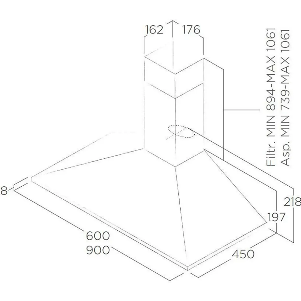 POINTS FORTS : CARACTÉRISTIQUES : • Commande : Tactile • Eclairage : LED 4 x 3 W • Finition : inox • SAV : 2 ans – SAV en France – Pièces, main d’oeuvre et déplacement • Marque : Elica • Coloris : Noir • Classe énergétique : D • Sortie d’air (mm) : 150 • Hauteur (mm) : 1061 • Profondeur (mm) : 450 • Largeur (mm) : 900 • Matière : Inox • Forme de la hotte : plateau • Type d’aspiration : extraction • Débit d’air min (m3/h) : 395 • Débit d’air max (m3/h) : 165 • Puissance (w) : 96 • Niveau sonore min (dB) : 49 • Niveau sonore max (dB) : 68 • Bon à savoir : Vendu en version aspirante avec extraction. Pour la version recyclage commander le filtre à charbon possibilité recyclage – filtre en option : CHACC090-A (ean 3663019058416 ) • Poids net (kg) : 10.6