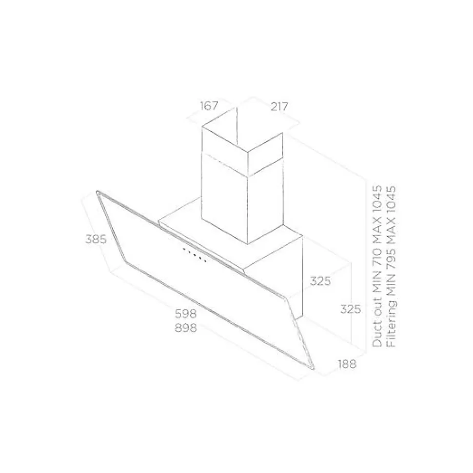 POINTS FORTS : • Hotte aspirante avec extraction • • Débit d’air max 650 (m³/h) • • Niveau sonore max 64 (db) • • Classe énergétique A CARACTÉRISTIQUES : • Commande : Tactile • Eclairage : LED 2 x 1 W • Finition : verre noir • SAV : 2 ans – SAV en France – Pièces, main d’oeuvre et déplacement • Marque : Elica • Coloris : Noir • Classe énergétique : A • Sortie d’air (mm) : 150 • Hauteur (mm) : 1045 • Profondeur (mm) : 188 • Largeur (mm) : 898 • Matière : Verre • Forme de la hotte : pan vertical • Type d’aspiration : extraction • Débit d’air min (m3/h) : 460 • Débit d’air max (m3/h) : 650 • Puissance (w) : 272 • Niveau sonore min (dB) : 52 • Niveau sonore max (dB) : 64 • Bon à savoir : Vendu en version aspirante avec extraction. Pour la version recyclage commander le filtre à charbon CHACC115 (ean 3663019048240). Le conduit et les côtés de la hotte sont noirs. • Poids net (kg) : 15.8