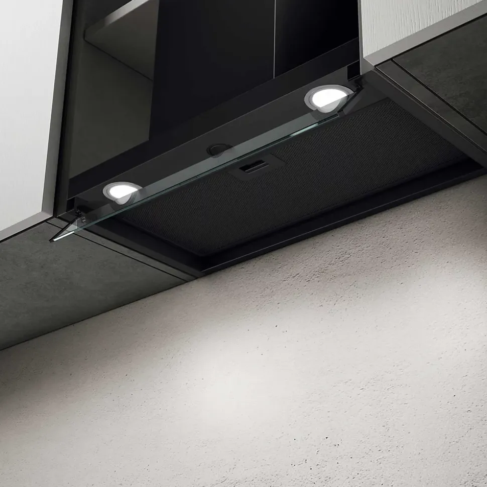 POINTS FORTS : • Hotte aspirante avec extraction •• Débit d’air max 581 (m³/h)•• Niveau sonore max 67 (db) •• Disponible en 60 ou 90 cm CARACTÉRISTIQUES : • Commande : Tactile • Eclairage : LED 2 x 2,5 W • Finition : acier inox • SAV : 2 ans – SAV en France – Pièces, main d’oeuvre et déplacement • Marque : Elica • Coloris : Noir • Classe énergétique : B • Sortie d’air (mm) : 150 • Hauteur (mm) : 339 • Profondeur (mm) : 310 • Largeur (mm) : 594 • Matière : Inox et verre • Forme de la hotte : encastrée • Type d’aspiration : extraction • Débit d’air min (m3/h) : 368 • Débit d’air max (m3/h) : 581 • Puissance (w) : 180 • Niveau sonore min (dB) : 46 • Niveau sonore max (dB) : 67 • Bon à savoir : La hotte est vendue en version aspirante avec extraction. Cependant, vous pouvez aussi l’installer en version recyclage en commandant le filtre à charbon. Référence filtre : CHACC115 (ean 3663019048240) • Poids net (kg) : 9.0