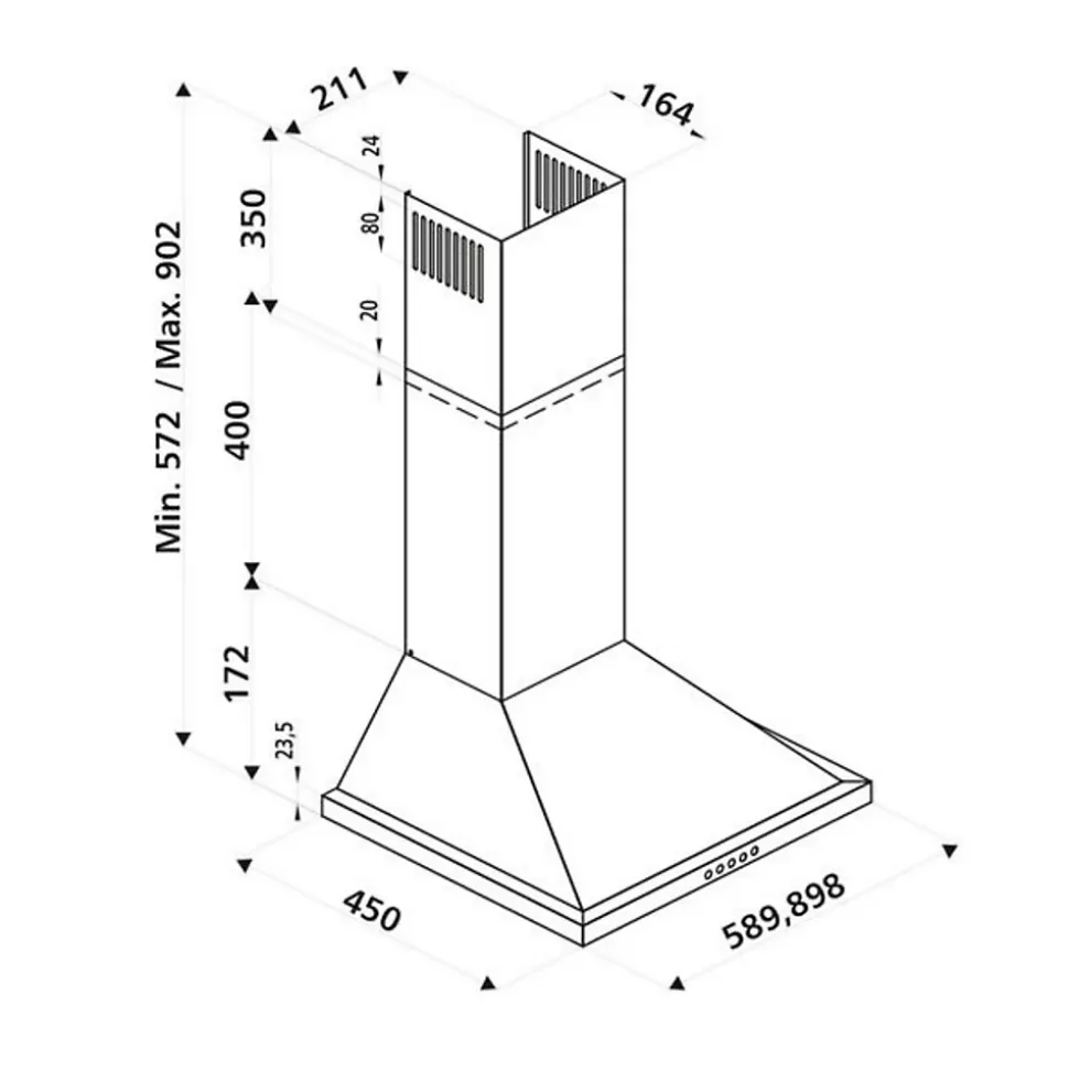 POINTS FORTS : CARACTÉRISTIQUES : • Commande : Tactile • Eclairage : LED 28 W • Finition : inox • SAV : 5 ans – En France métropolitaine pour toute hotte Silverline achetée à partir du 1er février 2023, sinon 3 ans • Marque : Silverline • Coloris : Inox • Classe énergétique : A • Sortie d’air (mm) : 120 • Hauteur (mm) : 572 – 902 • Profondeur (mm) : 450 • Largeur (mm) : 600 • Matière : Inox • Forme de la hotte : pyramide • Type d’aspiration : extraction • Débit d’air min (m3/h) : 245 • Débit d’air max (m3/h) : 648 • Puissance (w) : 125 • Niveau sonore min (dB) : 47 • Niveau sonore max (dB) : 68 • Bon à savoir : La hotte est vendue en version aspirante avec extraction. Vous pourrez également l’installer en reyclage, le filtre à charbon est inclus. • Poids net (kg) : 6.6