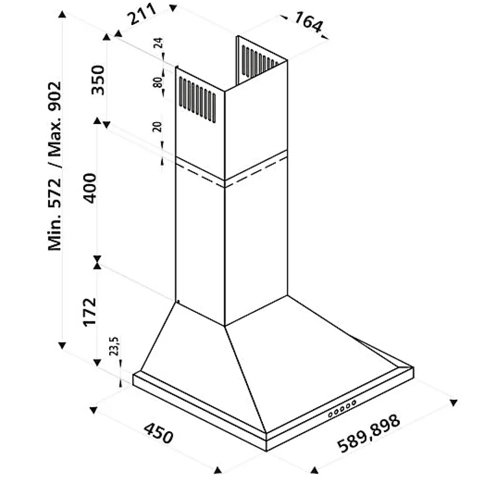 POINTS FORTS : CARACTÉRISTIQUES : • Commande : Tactile • Eclairage : LED 28 W • Finition : inox • SAV : 5 ans – En France métropolitaine pour toute hotte Silverline achetée à partir du 1er février 2023, sinon 3 ans • Marque : Silverline • Coloris : Inox • Classe énergétique : A • Sortie d’air (mm) : 120 • Hauteur (mm) : 572 – 902 • Profondeur (mm) : 450 • Largeur (mm) : 900 • Matière : Inox • Forme de la hotte : pyramide • Type d’aspiration : extraction • Débit d’air min (m3/h) : 245 • Débit d’air max (m3/h) : 648 • Puissance (w) : 125 • Niveau sonore min (dB) : 47 • Niveau sonore max (dB) : 68 • Bon à savoir : La hotte est vendue en version aspirante avec extraction. Vous pourrez également l’installer en reyclage, le filtre à charbon est inclus. • Poids net (kg) : 8.0
