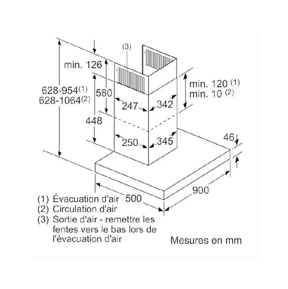 Hotte décorative – Ligne IQ500 – Largeur 90 cm – 5 vitesses dont 2 Intensives temporisées – Commandes TouchControl – Affichage digital – Ventilation automatique par intermittence pendant 10 minutes après utilisation – 3 filtres à graisse métalliques lavables au lave-vaisselle – Filtre à charbon en option (référence LZ53451) – En mode recyclage, vous devez impérativement monter le kit de recyclage (référence LZ53450) composé d’un filtre à charbon actif, d’un flexible, de colliers de serrage et d’un conduit d’aération – Moteur iQdrive : moteur induction basse consommation – Eclairage LED SoftLight avec intensité modulable – Sortie Ø 120/150 mm – Finition inox et verre noir.