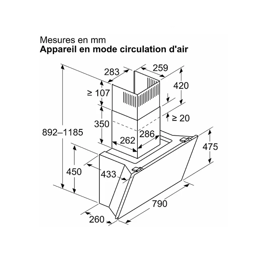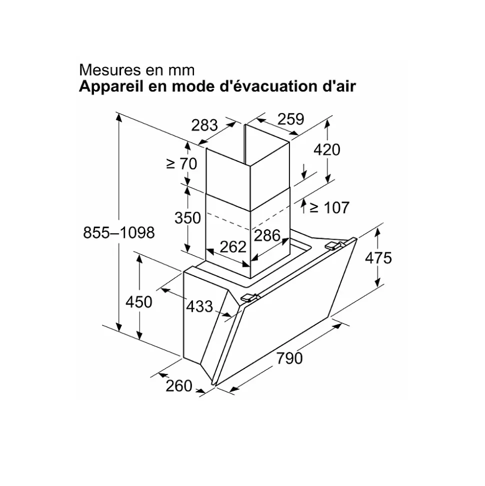 Hotte décorative inclinée 80cm 432m3/h noir Bosch – Hotte décorative inclinée Série 6 Bosch DWK81AN60 avec finition en verre. Plus pratique et plus ergonomique : contrôlez votre hotte à partir de la table de cuisson. Home Connect : des hottes connectées qui vous facilitent la vie. Technologie EcoSilence Drive™ : pour des hottes alliant puissance et économie d’énergie. Eclairage LED à faible consommation qui fournit une lumière blanche idéale pour votre zone de cuisson. Vitesse intensive : élimine efficacement et rapidement les odeurs. – Type de produit : Hotte décorative inclinée.Type de montage : Mural.Mode d’aspiration : Recylage ou évacuation.Puissance totale des moteurs : 190 W.Système de commandes : LED, touchControl.Nombre de vitesses : 3 vitesses + 1 intensif.Débit d’aspiration max. en évacuation : 432 m³/h.Débit d’air position intensive en évacuation : 915 m³/h.Puissance acoustique à vitesse max. (2010/30/EC) : 51 dB.Amplification de la puissance acoustique (2010/30/CE : 68 dB.Débit d’aspiration max. en recyclage : 438 m³/h.Débit de l’aspiration en Recyclage d’air position turbo : 886 m³/h.Niveau sonore max. (recirculation) : 60 dB.Niveau sonore boost (recirculation) : 78 dB.Matériau du filtre à graisses : Inox résistant au lave-vaisselle.Classe d’efficacité énergétique : A+.Consommation d’énergie : 35,5 kWh/a.PerfectAir – Adapte automatiquement l’aspiration aux fumées : Non.Contrôle de la hotte via la table de cuisson : Oui.EcoSilence Drive – Moteur économe et silencieux : Oui.Extra silencieux : Oui.Position intensive : Oui.Mode d’arrêt différé : 10 min.Nombre de lampes : 2.Luminance totale : 422 lux.Color temperature : Neutral (3.500 K).Eclairage SoftLight : Oui.Contrôle de la couleur de l’éclairage avec l’app Home Connect : Oui.EmotionLight Pro : halo de lumière autour de votre hotte : Non.Home Connect –
