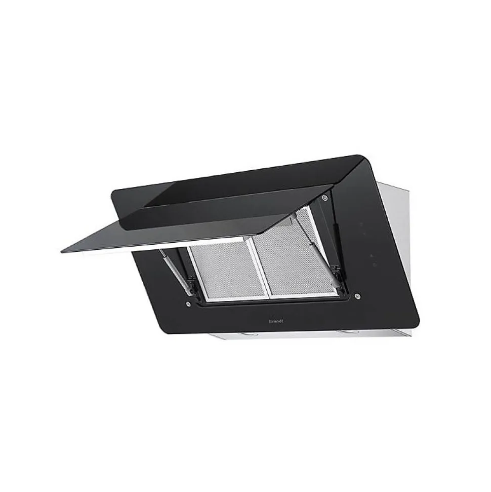 Hotte décorative inclinée 90cm 543m3/h inox/verre Brandt – Hotte décorative inclinée Brandt BHV1974IB avec Aspiration périphérique : La structure originale de votre hotte cache les filtres à graisse tout en conservant son efficacité. Commandes électroniques sensitives : Le réglage du débit ou de l’éclairage se fait par un simple effleurement du doigt sur le bandeau sensitif en verre. Le confort est garanti et la pureté des lignes préservée. Eclairage par LED : Afin de garantir une faible consommation électrique et un parfait éclairage ce modèle est équipé d’un éclairage par LED. Evacuation en option : pour cela, commandez le kit cheminée référence ATC-252X avec adaptateur sortie moteur. – Type de produit : Hotte décorative murale.Débit : 543 m3/h.Niveau sonore : 62 dB.Conso élec : 26 kWh / an.Connecté : non.Eco Label énergie : A+.Evacuation des vapeurs : A.Efficacité éclairage : A.Filtration des graisses : F.Le + produit : Finition inox et verre noirLargeur 90 cm.3 vitesses.Commandes électroniques sensitives.Aspiration périphérique.Filtre à graisse aluminium lavable.Filtre à charbon fourni (référence CF115).Eclairage LED.Sortie Ø 120/150 mm.Finition inox et verre noir.Type de hotte : incliné.Coloris : inox et verre.Cordon électrique : NC.Filtre à charbon : fourni.Filtre à charbon : CF115.Diamètre de la sortie d’air : 120 / 150 mm.Dimensions : L 90 x H 39 x P 39,4 (haut) cm.Poids net : 19 Kg.