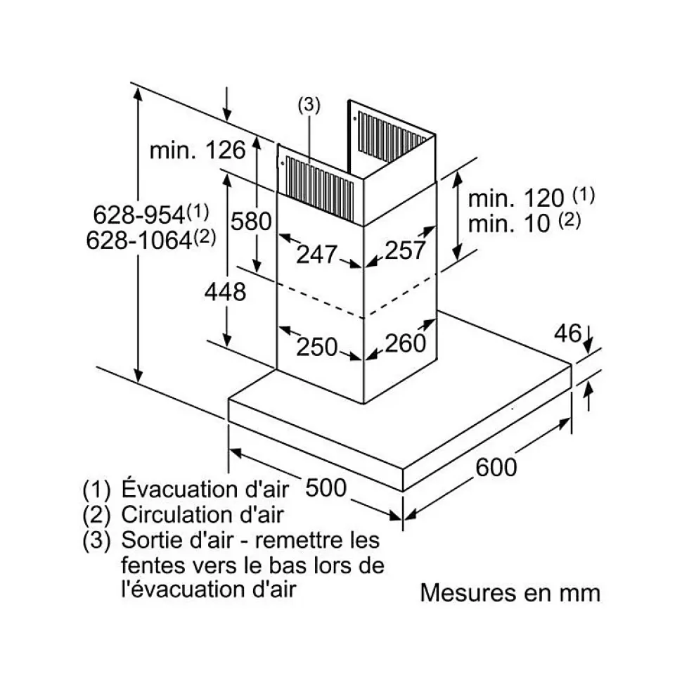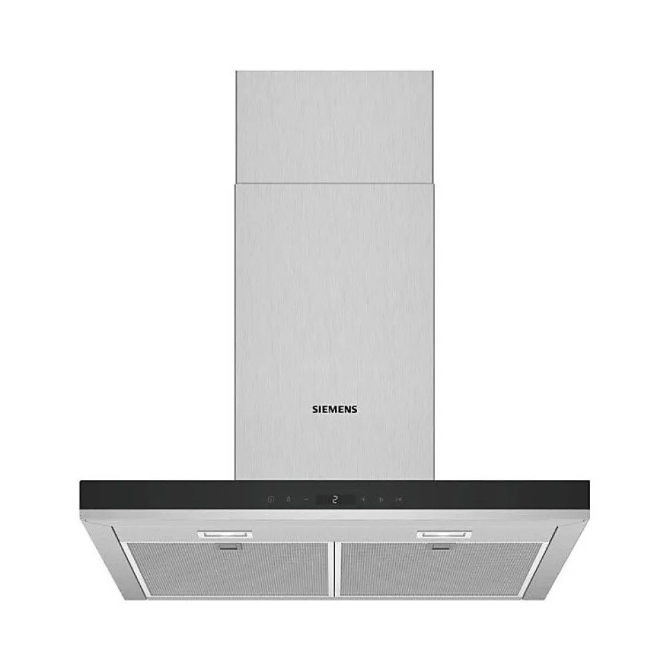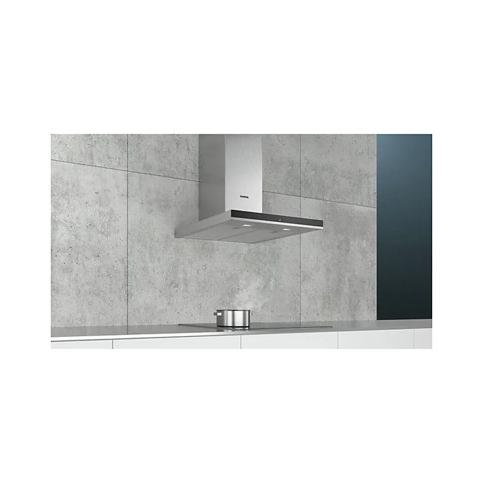 Hotte décorative murale 60 cm 674m3/h inox Siemens – La hotte murale est puissante, a un taux d’extraction élevé et un design modern.Moteur à induction pour une extraction silencieuse et performante des vapeurs.L’éclairage économique associé à la technologie LED assure une visibilité optimale lors de la cuisson.Taux d’extraction important(674 m³/h) pour une élimination efficace des odeurs et de la vapeur.Lumière LED: visibilité et atmosphère optimales lors de la cuisson.Extrêmement silencieux lors de l’utilisation(60 db(A)). – Hotte BoxMoteur iQdrive : moteur induction à basse consommationNombre de vitesses : 5 vitesses dont 2 intensivesClasse d’efficacité énergétique A* sur une échelle allant de A++ à EConsommation énergétique moyenne : 35.6 kWh/anClasse d’efficacité ventilateur : AClasse d’efficacité éclairage : AClasse d’efficacité filtre à graisse : BEn mode évacuation ou recyclage (avec kit en option)Un kit de recyclage est indispensable pour toute installation en mode recyclage (kit en option Niveau sonore (min/max) en fonctionnement normal : 47/60 dBDébit d’air en évacuation selon la norme DIN/EN 61591 : – fonctionnement normal : 416 m³/h- position intensive : 674 m³/hDébit maximum d’aspiration en recyclage d’air : 282 m³/hDébit de l’aspiration en Recyclage d’air position turbo : 325 m³/hCommande touchControl avec Affichage digitalPositions intensives avec retour automatique au bout de 6 minutesVentilation automatique par intermittence pendant 10 min après utilisationBooster temporiséPuissance de raccordement : 143 WIntensité lumineuse : 276 luxTempérature de couleur : 3500 KVariateur d’intensité lumineuse softLightEclairage LED 2 x 3 W2 filtres à graisse métallique lavable au lave-vaisselleTémoin de saturation du filtre métallique et à charbon actifAccessoires en option : LZ00XXP00, LZ10FXI05,