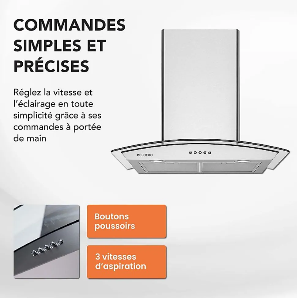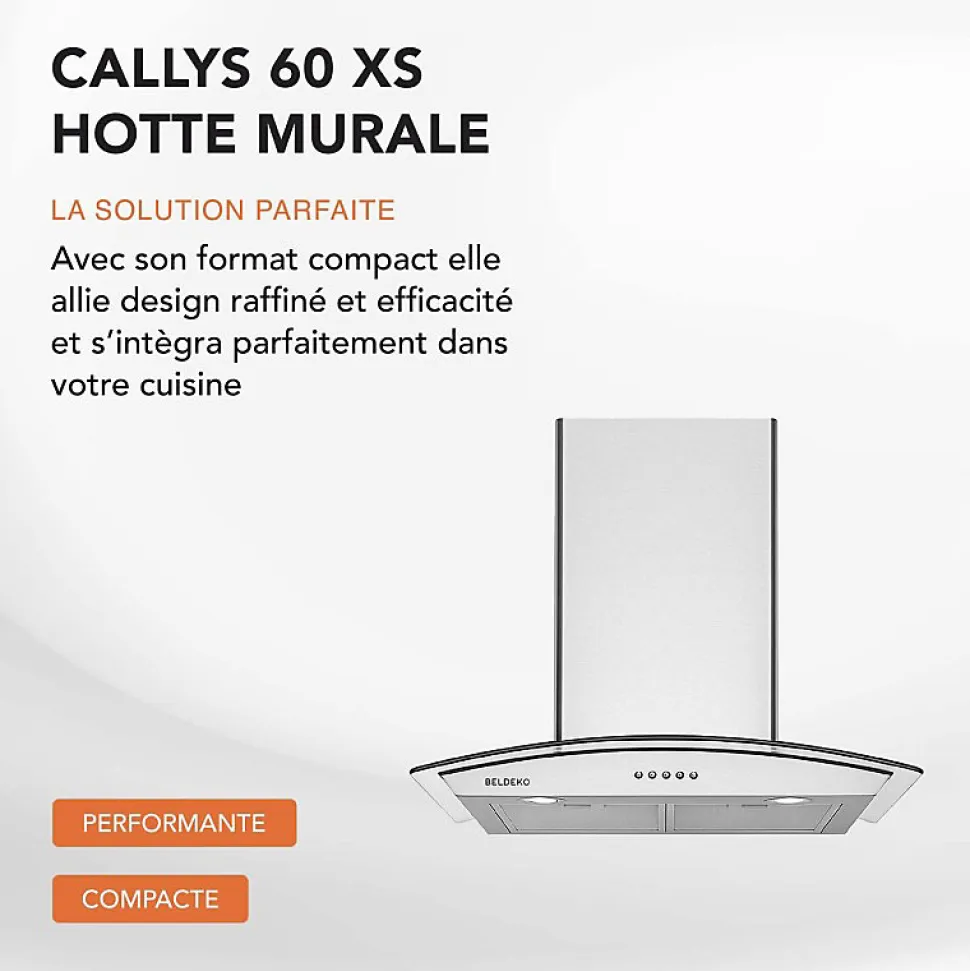 Hotte murale CALLYS 60 XS – Marque BELDEKO – Inox – Matière : Inox et verre