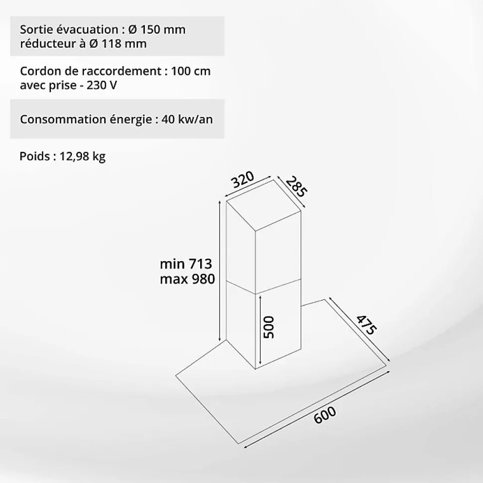 - Dimensions nettes (L x P x H) : 600 x 475 x mini 713 – maxi 980 mm – Poids net : 12,98 kg