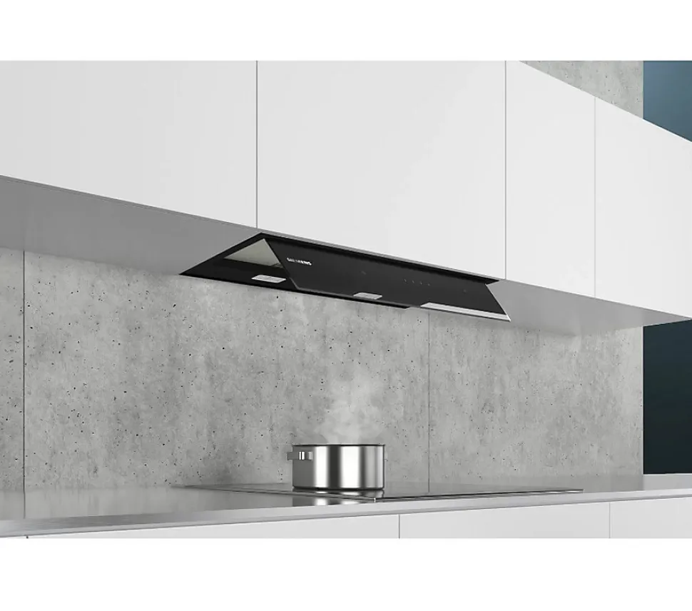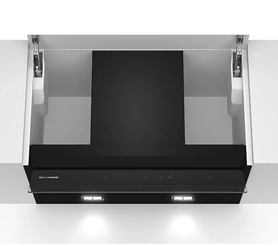 Hotte décorative murale Siemens LJ67BAM60 de 60 cm avec finition verre noir, design intégré, extraction et recyclage, éclairage LED, 4 vitesses dont 1 intensive, débit d’air jusqu’à 749 m³/h, niveau sonore jusqu’à 63 dB, classe énergétique B, filtre cassette en inox lavable, garantie 2 ans.