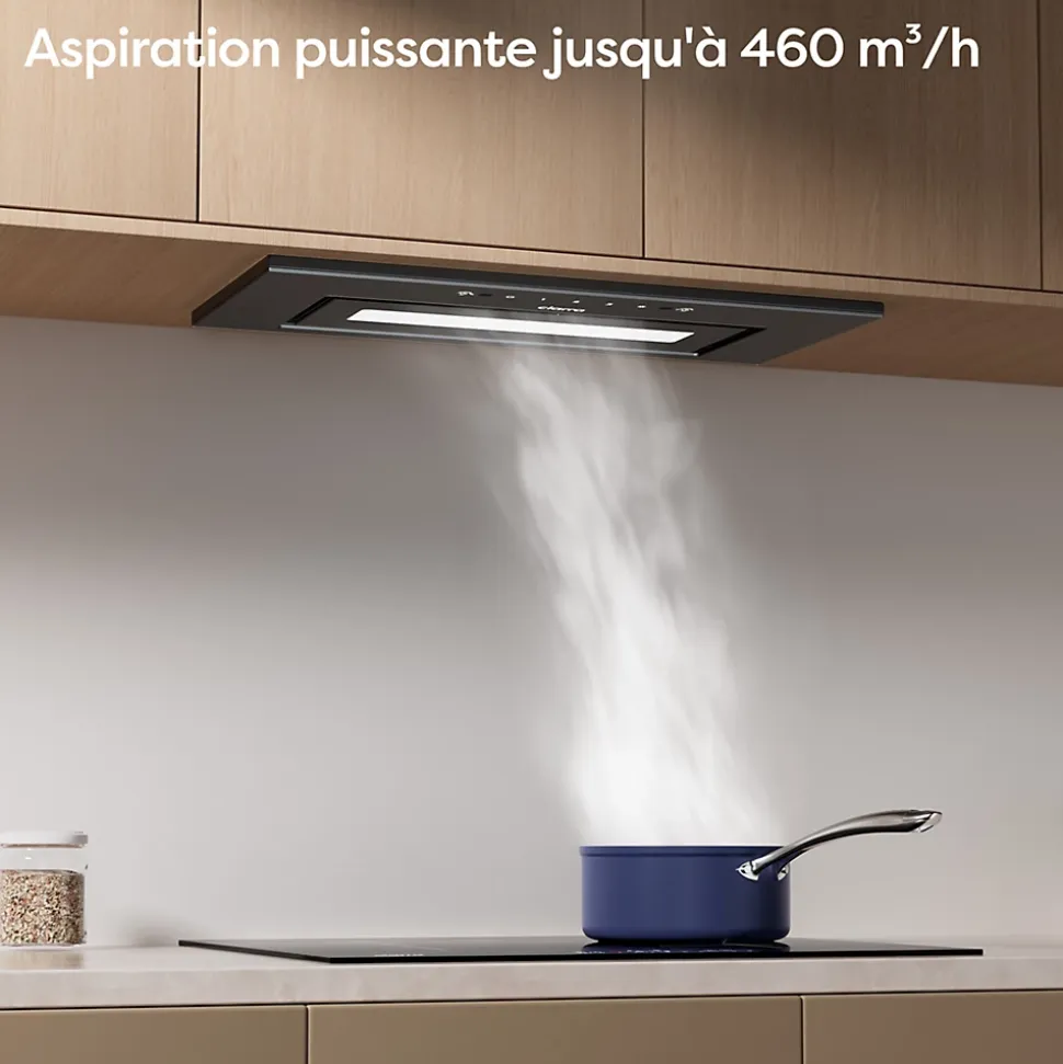 - Performant et silencieux : 3 vitesses d’aspiration jusqu’à 460 m³/h, avec un niveau sonore maximum de seulement 63 dB pour cuisiner en toute tranquillité.