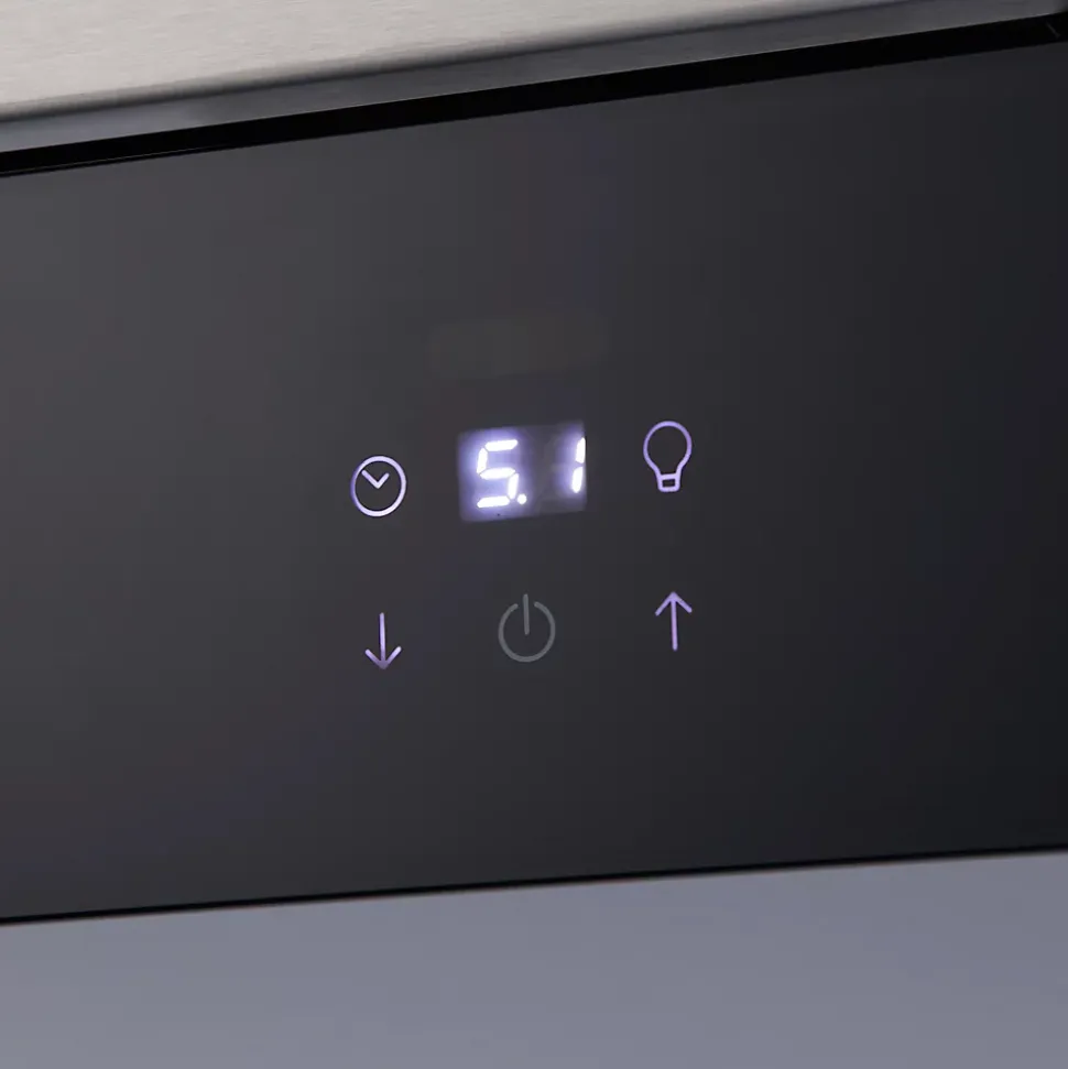 La hotte encastrable GoodHome est dotée d’un panneau de verre motorisé pour l’extraction, pouvant être activé par un détecteur de mouvement. Pour une commande automatique, associez la hotte avec une plaque de cuisson à induction GoodHome afin que cette dernière contrôle votre hotte de façon intuitive. Son moteur brushless classe A+ dispose de 5 niveaux de puissance ainsi que d’un puissant turbo boost en option. La fonction de minuterie automatique élimine les odeurs résiduelles dans la cuisine, même après la cuisson des plats. L’éclairage peut être réglé sur chaud ou froid, avec ou sans éclairage d’ambiance activé. La hotte peut être équipée d’un conduit d’évacuation vers l’extérieur ou utilisée en mode recyclage grâce à l’installation du filtre à charbon 50 en option, selon le besoin.