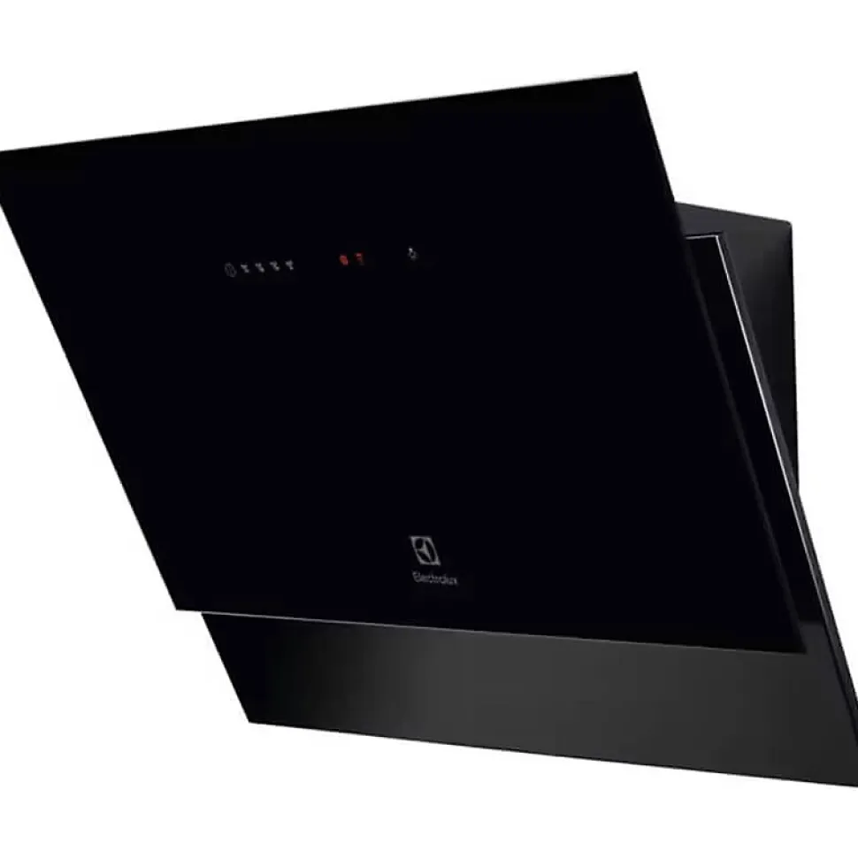 Hotte decorative Electrolux LFV426K noire 60cm, design mural incliné. Puissance d’extraction 600 m³/h, moteur 210W. Filtres aluminium lavables, filtre charbon pour recyclage inclus, indicateur saturation filtres. Eclairage LED classe A. Technologie Hob2Hood pour ajustement automatique. Commandes tactiles sur verre. Clapet anti-retour. Kit fixation inclus.
