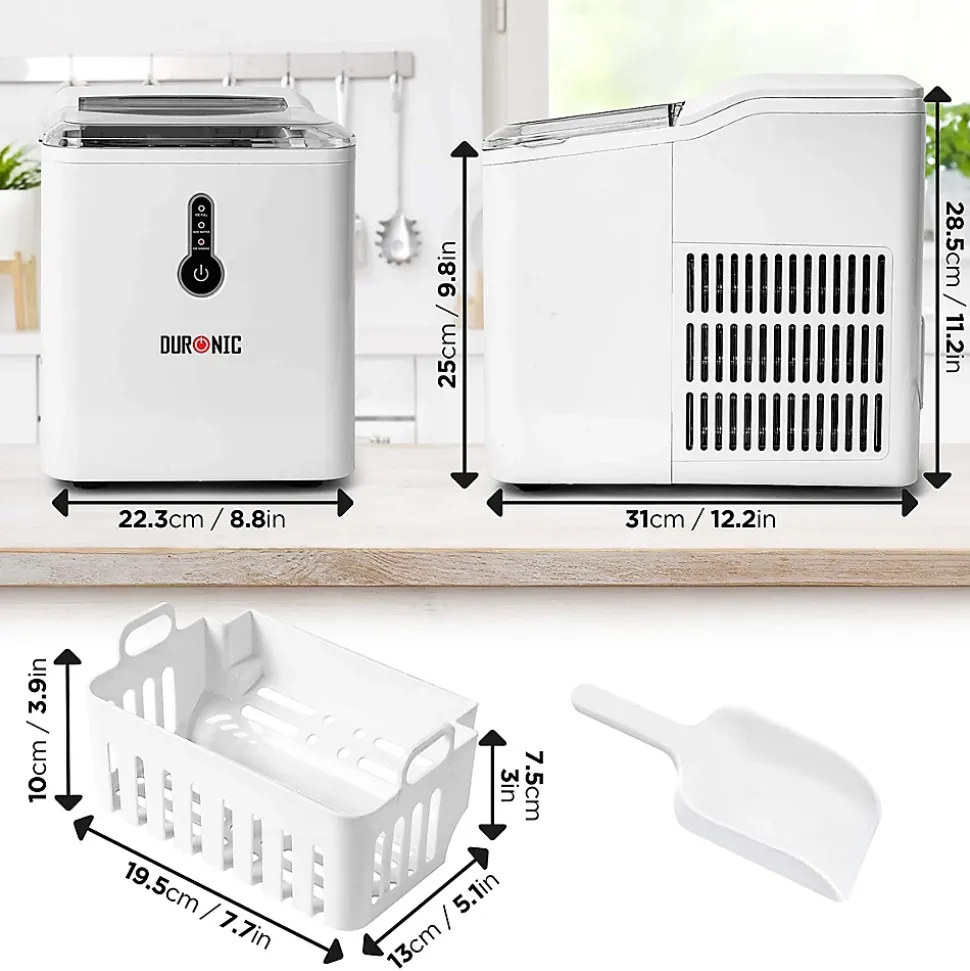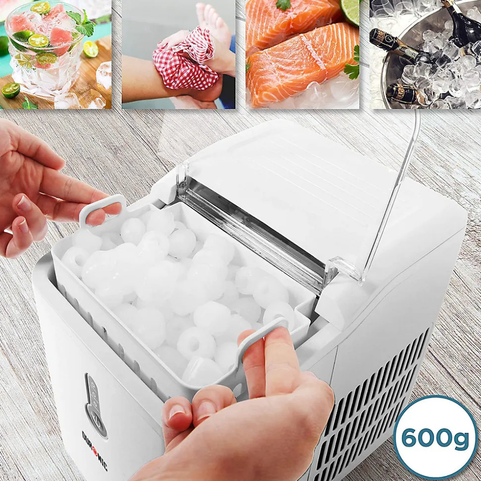 Découvrez la machine à glaçons ICM120 WE de Duronic qui vous facilitera la vie. Que vous soyez un hôte occasionnel ou un professionnel de la restauration, cette machine élégante et compacte est conçue pour répondre à tous vos besoins en glaçons. Vous ne serez jamais à court de glaçons. Vous n’aurez plus à préparer des glaçons manuellement au congélateur, cette machine fabrique les glaçons pour vous en quelques minutes ! Cette machine à glaçons peut produire jusqu’à 12 kg de glace par jour, ce qui la rend idéale pour les grandes fêtes, les restaurants, les cafés et les cuisines. De plus, elle est capable de produire des glaçons de différentes tailles, adaptés à vos besoins, que ce soit pour rafraîchir une boisson ou pour des desserts glacés. Trois voyants LED vous indiquent les étapes du processus: Plus besoin d’attendre longtemps pour obtenir vos glaçons. L’ICM120 WE peut produire jusqu’à 9 glaçons en seulement 7 à 9 minutes par cycle. Grâce à son design élégant et épuré de couleur blanche, il s’intègre parfaitement dans n’importe quel environnement. De plus, son format compact (22,3 x 28,5 x 31 cm) en fait un appareil discret et peu encombrant. Le câble mesure 122 cm. Cette machine à glaçons est conçue pour simplifier votre vie: elle est équipée d’une fonction d’auto-nettoyage pour un entretien sans tracas. De plus, l’ICM120 WE dispose d’un bac à glaçons pouvant contenir jusqu’à 600 grammes de glace et d’une cuillère à glace pour une utilisation immédiate. La capacité de son réservoir d’eau est de 1,5 litre. Que vous organisiez une fête estivale, un dîner à la maison ou que vous ayez simplement besoin de glaçons au quotidien, l’ICM120 WE est l’appareil idéal. Parfait pour rafraîchir vos boissons préférées, préserver les aliments, ou préparer des desserts glacés comme des granités, des cônes de neige et bien d’autres. Ne manquez jamais de glaçons avec l’ICM120 WE de Duronic.
