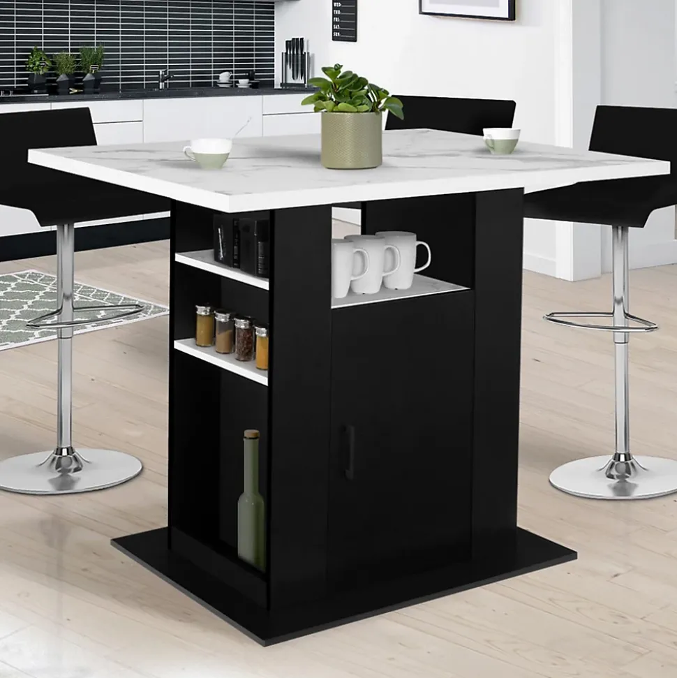 Optimisez et organisez l’espace de votre cuisine grâce à notre îlot central avec plan de travail et rangements intégrés au coloris en bois noir et plateau effet marbre !Son design bi-matière et ses couleurs sobres tout en contraste lui permettent de s’adapter idéalement à tout type d’intérieur ! Il conférera un aspect net et rangé à votre cuisine !Son format généreux et néanmoins compact, peu encombrant, facilite la circulation tout en évitant les pas inutiles au quotidien dans votre pièce de vie. Il structure l’espace de votre cuisine ! Parfait pour les pièces de vie ouvertes et aérées.Avec son grand plateau 110 x 80 cm solide (PB épaisseur 3 cm), cette table de bar vous offrira un plan de travail supplémentaire pour élaborer vos préparations. Le plateau déborde de chaque côté de la structure centrale pour vous permettre de disposer en-dessous des tabourets de bar et accueillir ainsi jusqu’à 6 personnes !Ultra fonctionnel ce meuble de bar comporte de nombreux rangements. Un placard central qui s’ouvre de chaque côté vous permettra d’entreposer vaisselle, couverts et ustensiles de cuisine et d’y accéder facilement grâce à ses deux portes. Sur le côté, les 3 étagères seront parfaites pour garder à portée de main condiments, verres ou encore bouteilles. De quoi optimiser au maximum votre espace !Sa structure robuste en PB (panneaux de particules de bois, épaisseur 1,5 cm) lui assure stabilité et robustesse pour un usage au quotidien !Tantôt coin repas, tantôt coin cuisine, avec sa triple fonction table haute de bar/plan de travail/meuble de rangement, il vous fera gagner du temps et de l’espace, et apportera un esprit « bohème chic » à votre intérieur !Laissez-vous séduire par cet îlot pratique et fonctionnel et faites entrer la tendance effet marbre chez vous !Dimensions de la table îlot de cuisine effet marbre et bois noirDimensions globales : Longueur 110 cm x largeur 80 cm x Hauteur 90 cmDimensions placard : L. 40 x l. 36,5 x H. 60 cmDimensions niche centrale : L. 4
