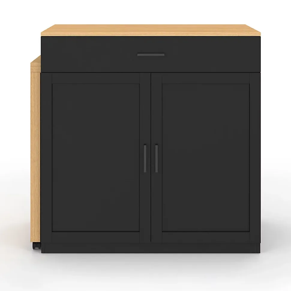 Apportez un style moderne et une grande fonctionnalité à votre cuisine grâce à cet îlot central bois et noir au design soigné ! Conçu pour faciliter votre quotidien tout en sublimant votre intérieur, il combine intelligemment espace de rangement et coin repas.Son format généreux mais néanmoins compact, peu encombrant, facilite la circulation tout en évitant les pas inutiles au quotidien dans votre pièce de vie. Il structure l’espace de votre cuisine! Parfait pour les pièces de vie ouvertes et aérées !Côté praticité, cet îlot est équipé d’un tiroir central coulissant, idéal pour vos couverts et ustensiles, ainsi que d’un placard fermé avec étagère pour dissimuler vaisselle, provisions ou électroménager léger.À l’arrière, deux étagères ouvertes offrent un accès rapide à vos objets du quotidien ou éléments déco. Mais ce n’est pas tout ! Le meuble intègre également une table extensible coulissante qui se déploie en un clin d’œil. Parfaite pour déjeuner sur le pouce ou profiter d’un espace de préparation supplémentaire.Tantôt coin repas, tantôt coin cuisine, avec sa triple fonction table haute/plan de travail/meuble de rangement, il vous fera gagner du temps et de l’espace, et apportera un look contemporain à votre intérieur !Avec son bicolore noir et bois clair, cet îlot s’intègre facilement dans tous les styles d’intérieur : scandinave, contemporain ou naturel. Un meuble gain de place malin, esthétique et multifonction !Dimensions de l’îlot central de cuisine VITODimensions globales (extensible) : Longueur 155 cm x largeur 60 cm x Hauteur 90,5 cmDimensions globales (table fermée) : L. 94 x l. 60 x H. 90,5 cmDimensions de la partie table : L. 65 x l. 55 x H. 74 cmFaçade du tiroir : L.90 x H. 14,5 cmDimensions intérieures du tiroir : L. 82 x l. 28,5 x H. 9 cmDimensions des étagères : L. 87 x H. 28,5 cmÀ monter soi-mêmeProduit vendu seul, sans les tabouretsDécouvrez également l’ensemble de nos meubles et éléments de cuisine sur notre boutique en ligne !