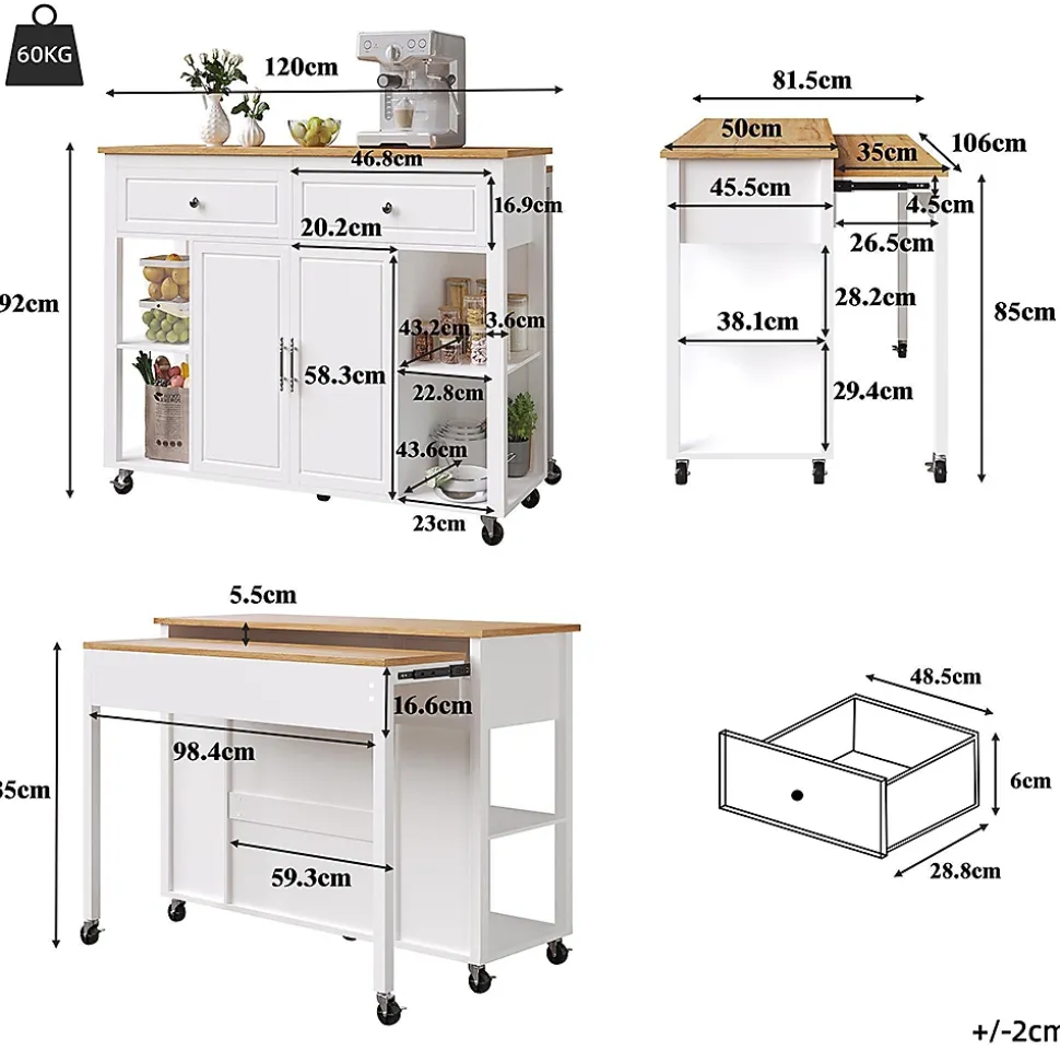 Caractéristiques du produitDimensions de l’emballageSous-article 1 : 123,19 * 54,61 * 14,48 cm 27,9 kgSous-article 2 : 135,26 * 57,79 * 14,99 cm 29,95 kgDétails du produitDimensions du produit Dimensions totales (plié) : 120*50*92 cm (L x l x H).Dimensions totales (déplié) : 120*81,5*92 cm (L x l x H).Poids du produit 53 cmMatériau Métal, MDFPoids supporté 60 cmMontage requis 30 minutesContenu de la livraison Un îlot de cuisine, pièces pour le montageNombre de colis 2Pays d’origine ChineCouleur principale : BlancMatériau principal : MDF, métal