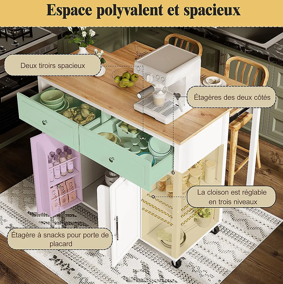 - Deux tiroirs spacieux : deux tiroirs spacieux avec un agencement intelligent. Solution de rangement parfaite pour les ustensiles de cuisine dans ce chariot de service.