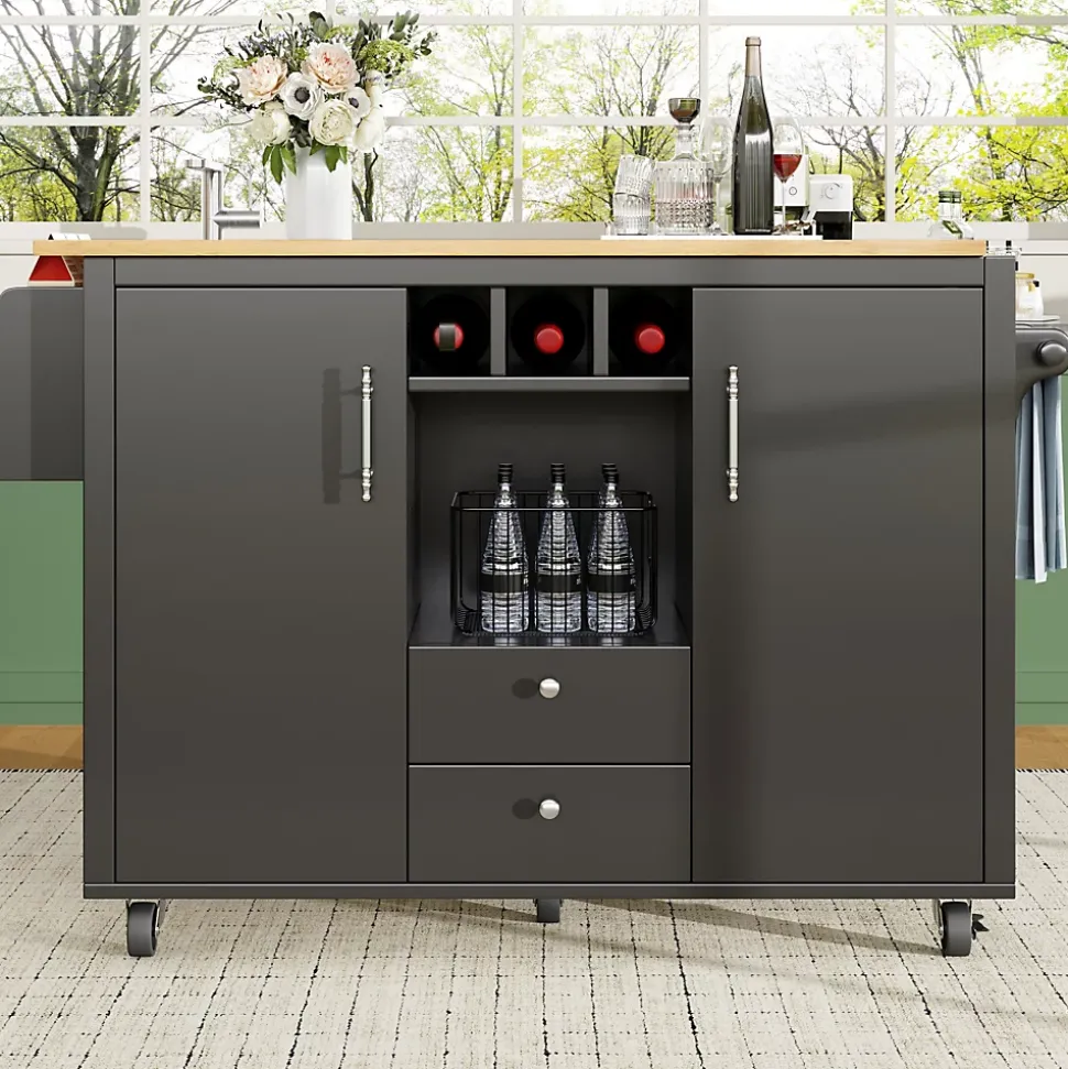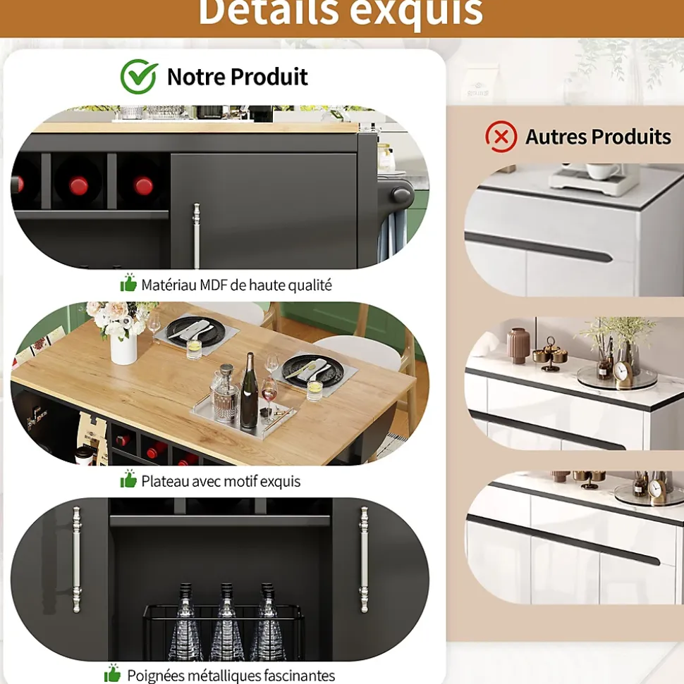 Caractéristiques du produit1. Dimensions : L’îlot de cuisine mesure 137,9 cm de long, 73 cm de large et 92,2 cm de haut, offrant un espace de travail généreux.2. Grand espace de rangement : Deux tiroirs, des portes doubles avec étagères, des compartiments pour répondre à divers besoins de rangement, un casier à bouteilles, des étagères ouvertes et des porte-serviettes et porte-épices de chaque côté optimisent le confort et l’efficacité de la cuisine.3. Table pliante : Peut être utilisée directement comme table à manger pour préparer facilement les repas au quotidien. Sa conception pliante est pratique et permet un gain de place.4. Robuste et durable : Les poignées chromées des tiroirs et des portes d’armoires sont non seulement esthétiques, mais aussi résistantes à la rouille. La structure en acier tubulaire, associée aux porte-serviettes et porte-épices, garantit robustesse et durabilité.5. Îlot de cuisine mobile : Cinq roulettes pivotantes à 360° permettent de déplacer facilement l’îlot entre la cuisine, la salle à manger et le salon.Détails du produit :1. Dimensions déplié : 137,9 x 73 x 92 cm (Longueur x Largeur x Hauteur)2. Dimensions plié : 137,9 x 45 x 92 cm (Longueur x Largeur x Hauteur)3. Poids du produit : 47,4 kg4. Matériaux : Panneaux de fibres de moyenne densité, métal5. Couleur : Noir6. Charge maximale : 60 kg7. Temps de montage : 30 minutes8. Contenu de l’emballage : Un îlot de cuisine, accessoires de montage9. Nombre de colis : 210. Pays d’origine : Chine11. Remarque : Le produit sera expédié en deux colis et peut arriver en plusieurs fois. Veuillez prévoir quelques jours pour la livraison.
