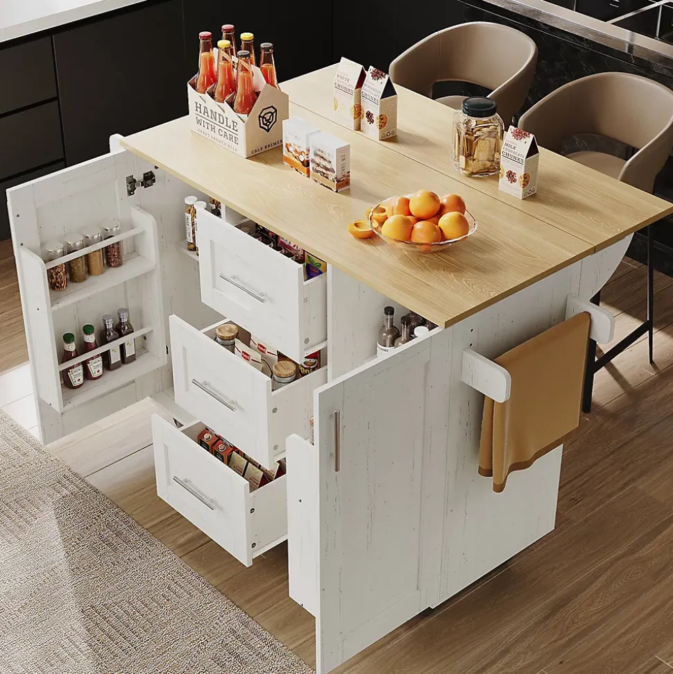 Caractéristiques du produit1.Ce chariot de cuisine est doté de panneaux latéraux rabattables qui se déplient pour former une table à manger de 74 cm de long.2.Le plateau est en bois massif de haute qualité avec une finition veinée. Ce matériau durable résiste à l’usure quotidienne, ce qui en fait une surface de travail idéale pour couper les légumes, préparer les aliments et réaliser d’autres tâches culinaires. Les tiroirs sont équipés d’élégantes poignées ergonomiques en alliage de zinc pour une ouverture facile et pratique.3.Le chariot est équipé de cinq roulettes avec freins pour une maniabilité optimale et une stabilité parfaite à l’arrêt.4.Trois tiroirs spacieux offrent un grand espace de rangement pour les petits objets ou effets personnels. Leur conception assure un accès facile tout en préservant une apparence soignée et ordonnée. Un porte-snacks est astucieusement intégré aux portes des placards pour ranger les en-cas, les flacons de condiments et autres petits articles.5.De plus, un porte-serviettes pratique est inclus pour suspendre les torchons, les essuie-mains ou autres textiles.Détails du produit :1.Dimensions dépliées : 135 x 46-74 x 86,6 cm (L x l x H)2.Dimensions pliées : 135 x 46-74 x 87,2 cm (L x l x H)3.Poids du produit : 48,7 kg4.Matériaux : Métal, panneaux de fibres de moyenne densité (MDF)5.Charge maximale supportée : 60 kg6.Temps de montage : 30 minutes7.Contenu de l’emballage : Un îlot de cuisine, accessoires de montage8.Quantité : 29.Pays d’origine : Chine