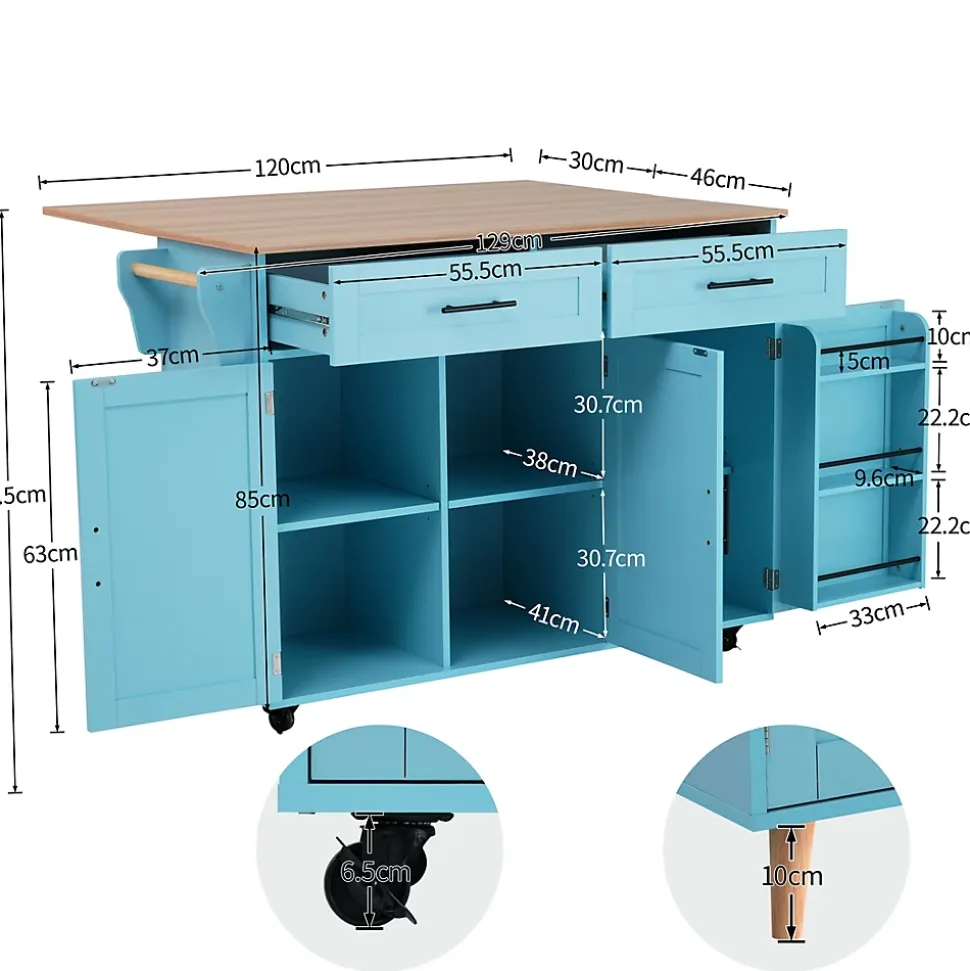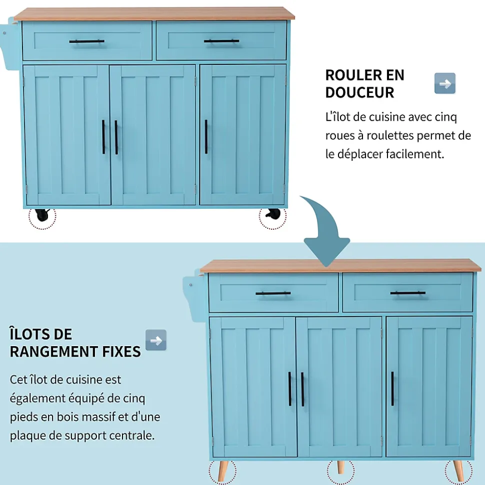 ▶ ▶ Détails ▶────────────────● Type de produit : Chariot de cuisine● Dimensions : L 129 x P 71 x H 91,5 cm● Matériau : Panneau de particules● Couleur : Bleu● Nombre de tiroirs : 2● Nombre de roulettes : 4● Nombre de pieds en bois massif : 5● Porte-serviettes : 1● Capacité de la tablette : 40 kg● Capacité de la tablette rabattable : 10 kg● Capacité du rayon : 20 kg● Capacité du tiroir : 10 kg● Nombre recommandé de personnes : 2● Temps de montage : 40-80 minutes● Nombre de colis : 2► Remarques ►※ Ce produit est livré en 2 colis. Ils peuvent ne pas arriver en même temps. Merci de patienter.※ En raison des mesures manuelles, une tolérance de 2-3 cm peut se produire.※ En raison des conditions d’éclairage, la couleur réelle peut différer légèrement de l’image du produit. Veuillez vous référer au produit reçu.※ Si vous avez des questions pendant l’installation, veuillez nous contacter dès que possible.