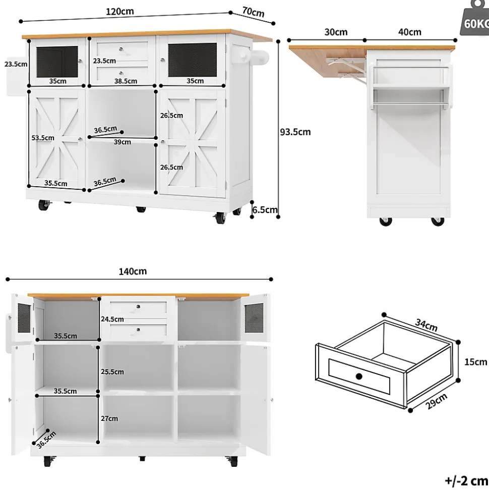 - 【Tablette Pliable Pratique】 La table avec des côtés extensibles vous permet d’agrandir rapidement la surface de travail à 70 cm. Pratique lors de la préparation des repas, du service ou même en tant que table à manger dans une petite cuisine ou salle à manger.