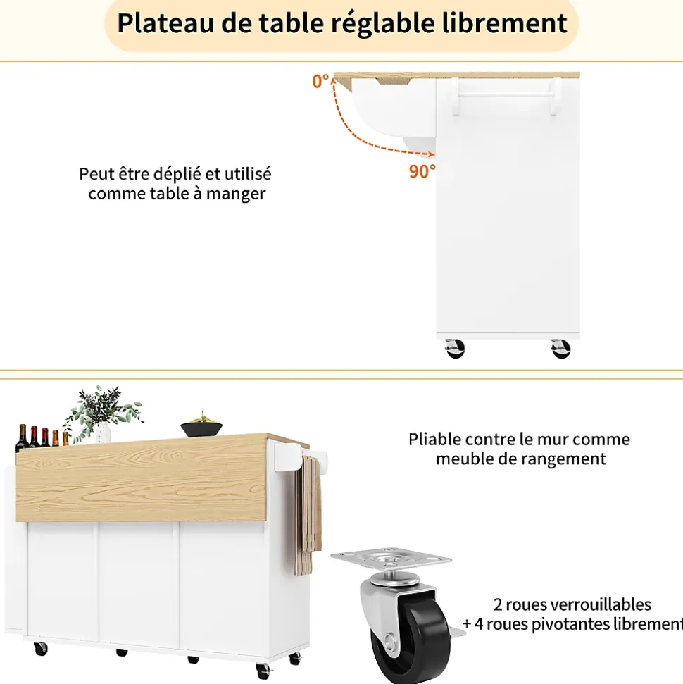 - 【Design pratique et modulable】 La table du chariot de cuisine se déplie pour devenir un espace repas fonctionnel, offrant un usage polyvalent qui s’adapte aux besoins de repas rapides ou de préparation culinaire dans un espace réduit.