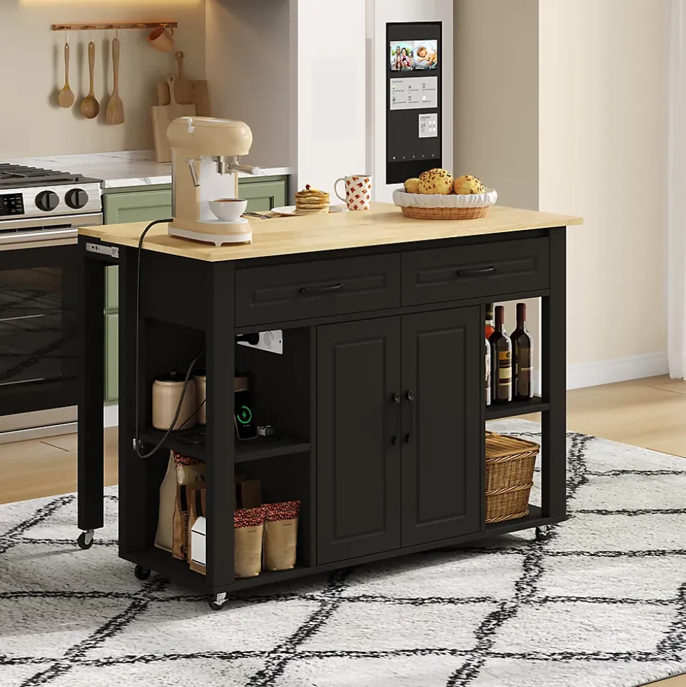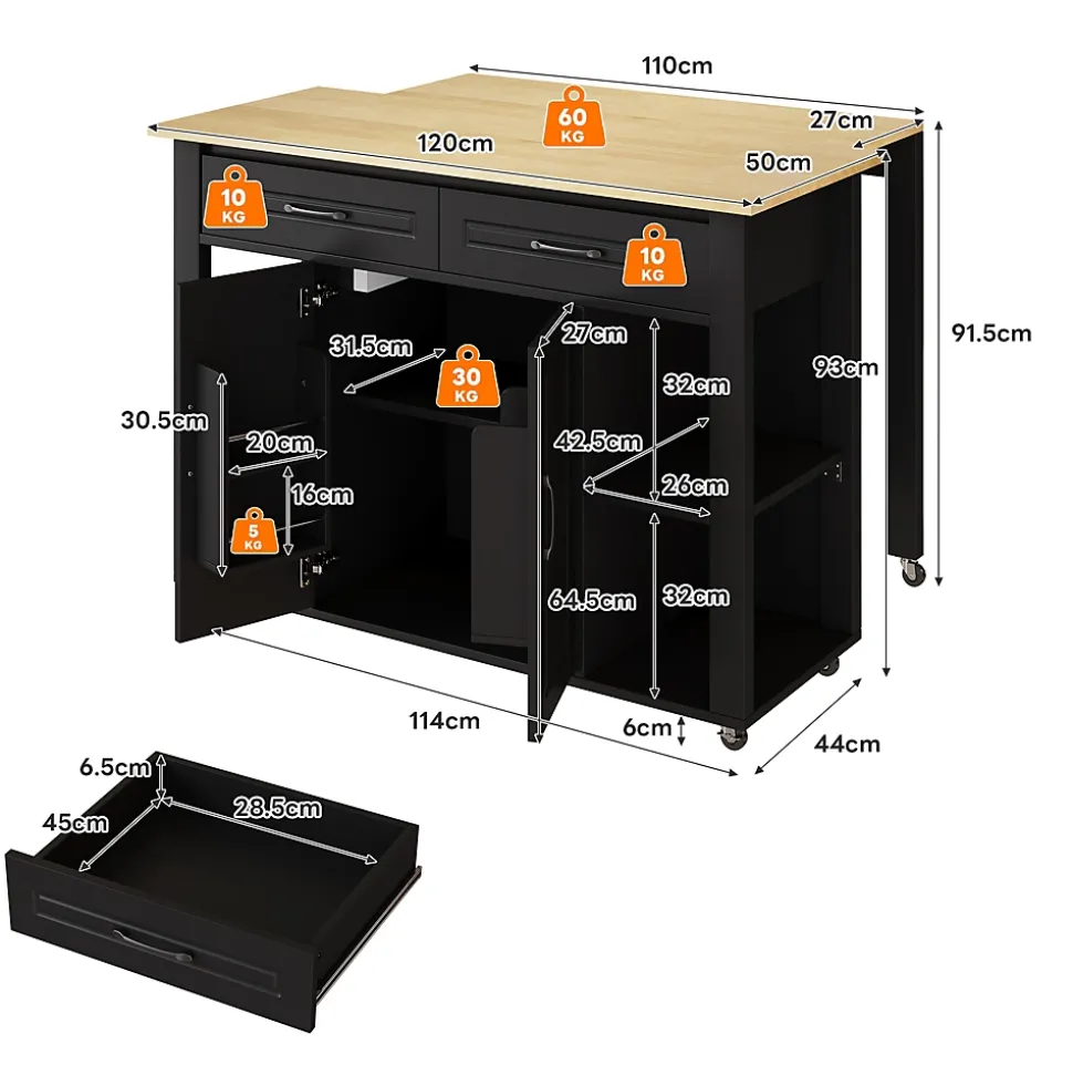 ▶ ▶ Détails ▶────────────────● Type de produit : Îlot de cuisine● Matériau : MDF● Couleur : Noir + Naturel● Pièces adaptées : Cuisine, salle à manger, salon● Dimensions totales : 120 × 77 × 93 cm● Poids net : 50 kg● Plan de travail : 120 × 50 cm● Barre de comptoir / Table extensible : 110 × 27 cm● Prises électriques : 2 × AC + 2 × USB● Tiroirs : 2● Portes d’armoire avec étagères de porte : 2● Compartiments de rangement ouverts : 4● Mobilité : Roulettes (2 avec frein)● Montage requis : Oui● Nombre de colis : 2► Remarques ►※ La couleur réelle du produit peut légèrement différer de l’image en raison de l’éclairage ou de l’affichage.※ De légères variations peuvent survenir en raison de la mesure manuelle.※ Ce produit est livré en 2 colis.※ Si vous avez des questions lors de l’installation, veuillez contacter notre service client.
