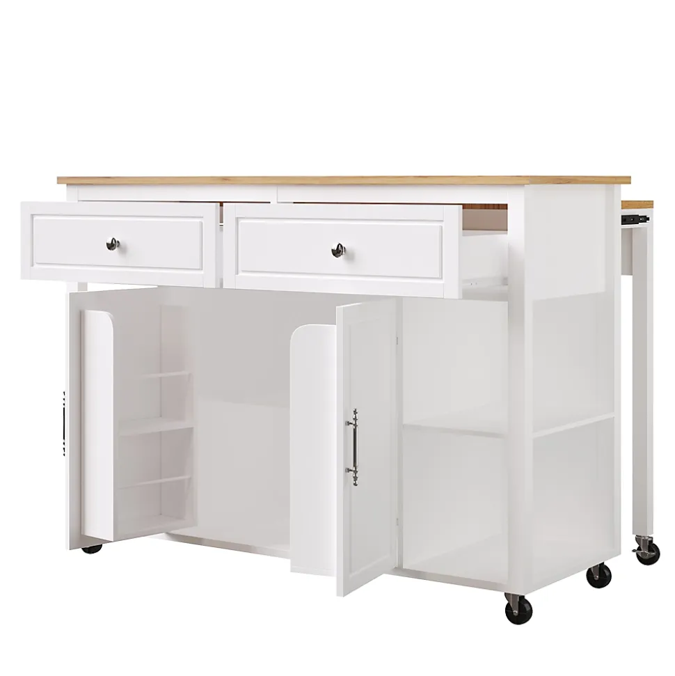 - 【Rangement polyvalent】 L’îlot propose deux tiroirs spacieux et des étagères latérales réglables à trois niveaux, accompagnés de rangements intégrés aux portes, pour organiser facilement ustensiles, vaisselle et aliments de différentes tailles.