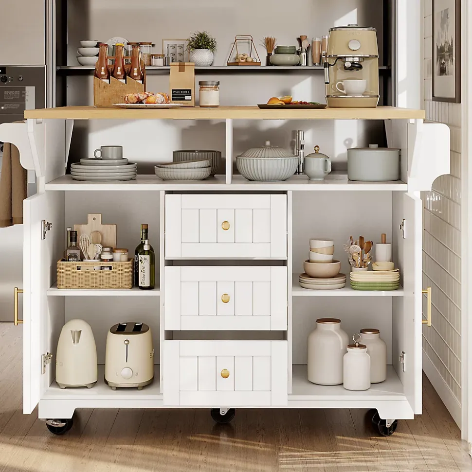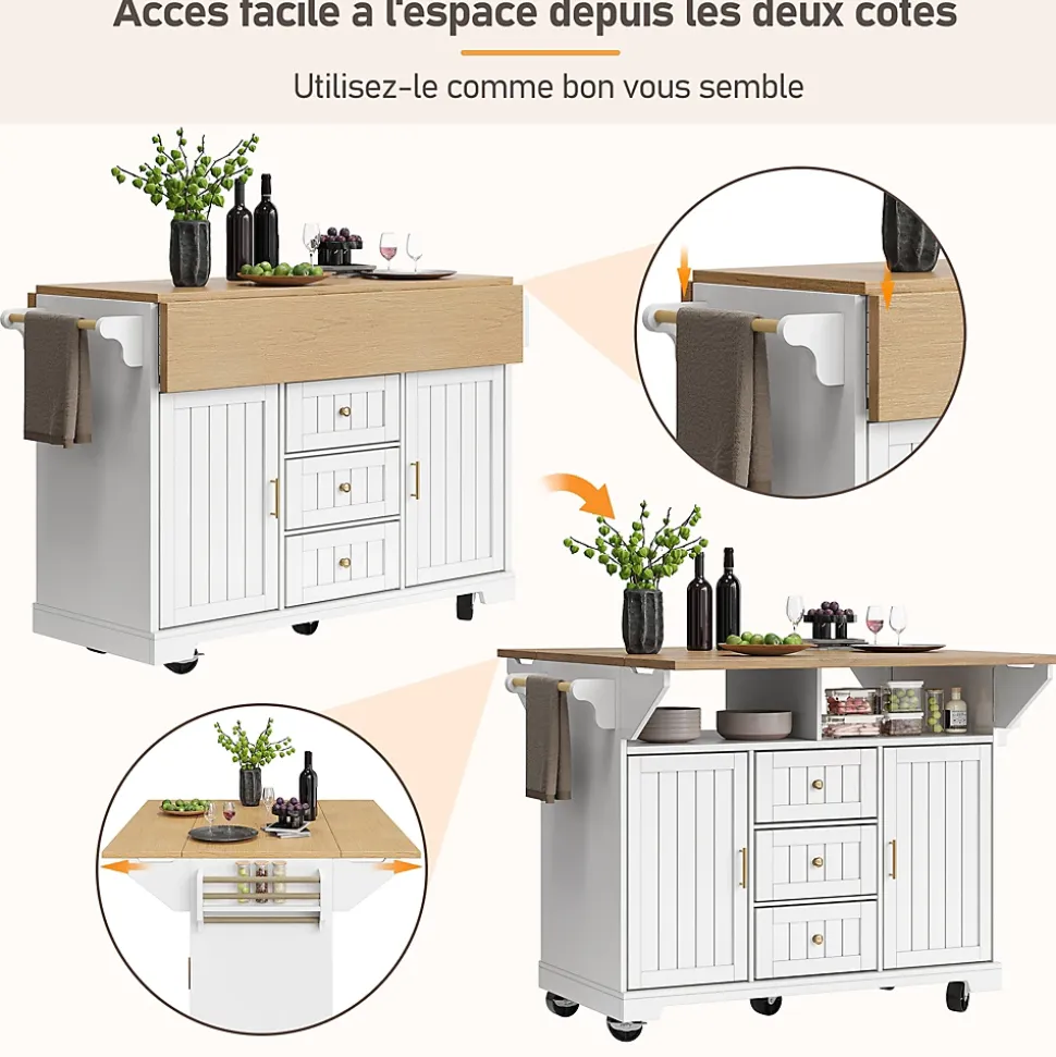 - 【Taille ajustable par clapet】 La table rabattable sur les deux côtés double la surface utilisable, permettant d’utiliser l’îlot comme espace de préparation ou table à manger, s’adaptant aux besoins changeants de la cuisine et des repas partagés.