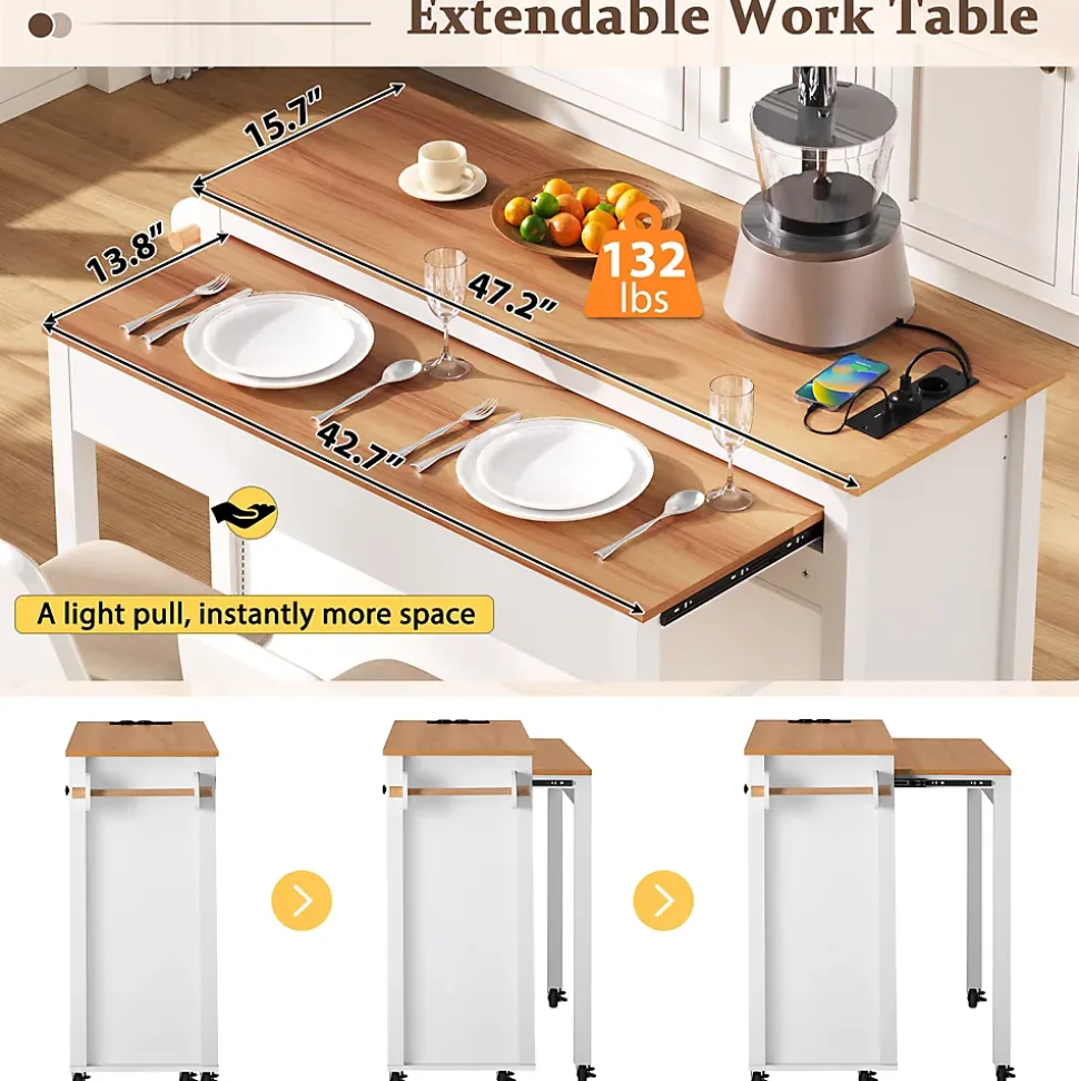 - 【Plan de travail extensible】 La surface coulissante s’étend facilement pour offrir plus de place lors de la préparation des repas, permettant de cuisiner confortablement à plusieurs sans limiter l’espace de travail initial.